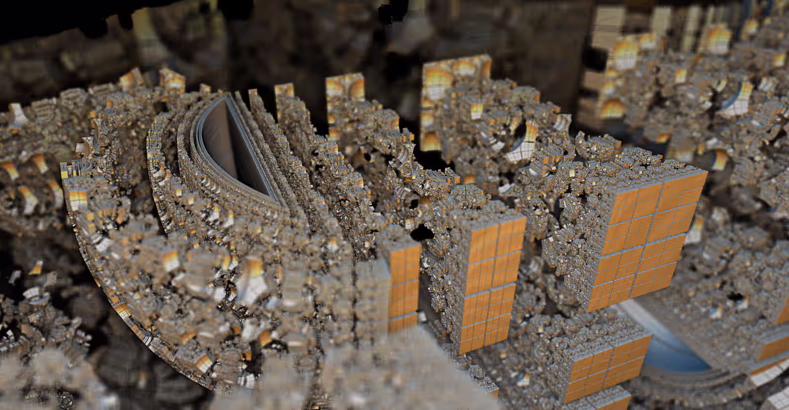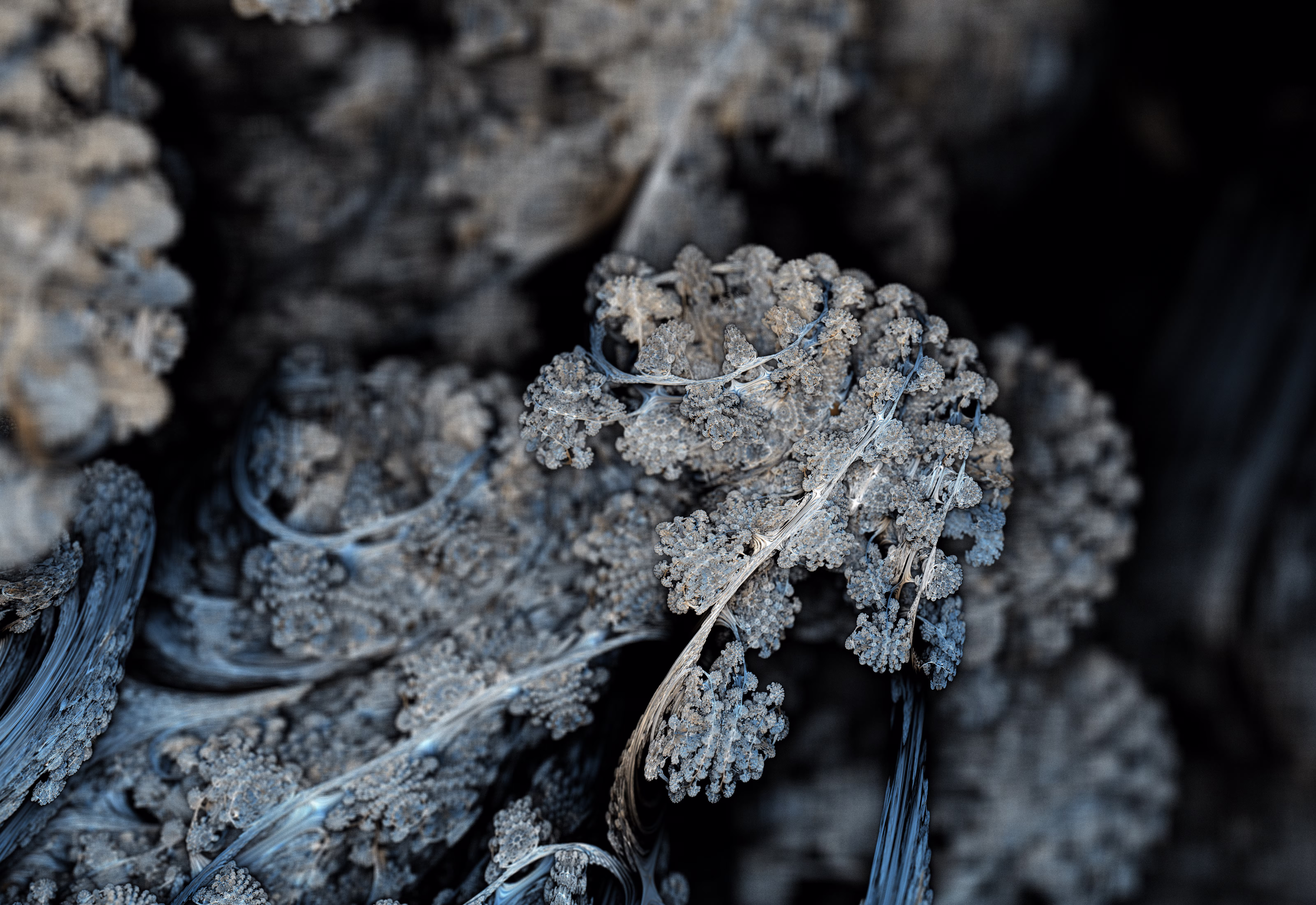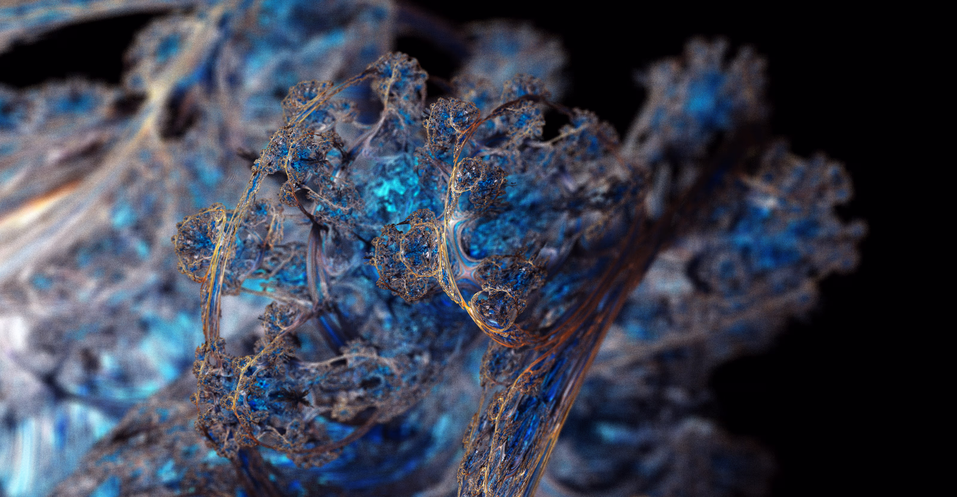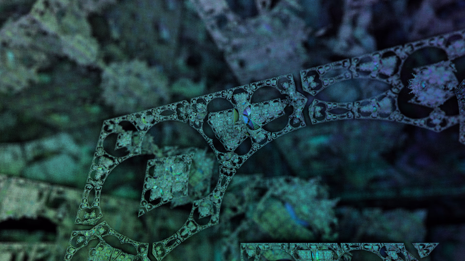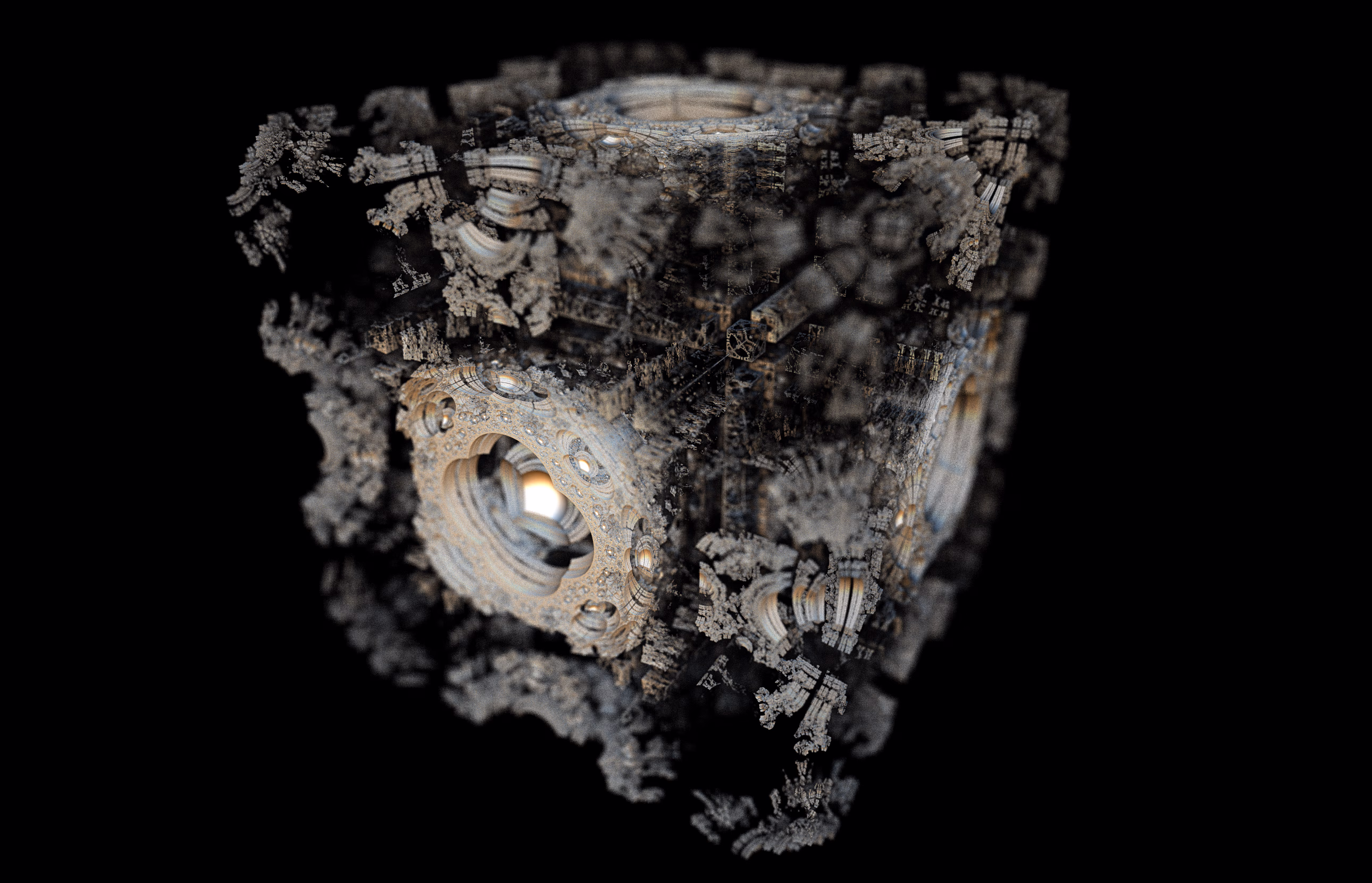I wrote a custom GPU-based program to render the images in tiles, with multiple passes for supersampling. It has a virtual camera with a lens and a focal length, which I've adjusted so that the most interesting parts are in focus. Without a depth of field, the details are often difficult to see against a background of infinitely many more self-similar details. The focus gives objects a sense of depth when the background is decoratively blurred and the focal point becomes highlighted. The camera lens's diameter also adds a reference scale to the image. Without it, the fractal would look identical at all scales!