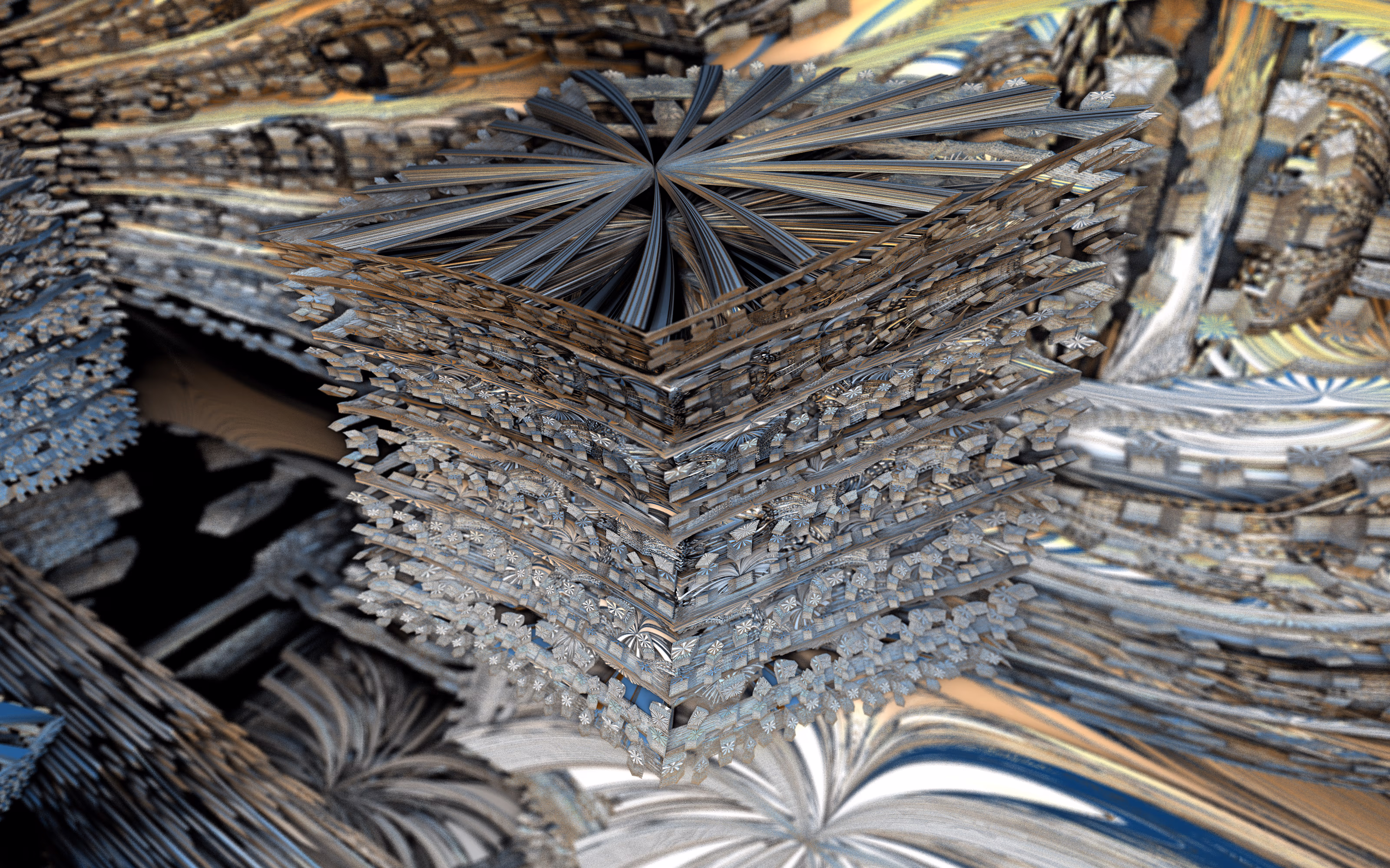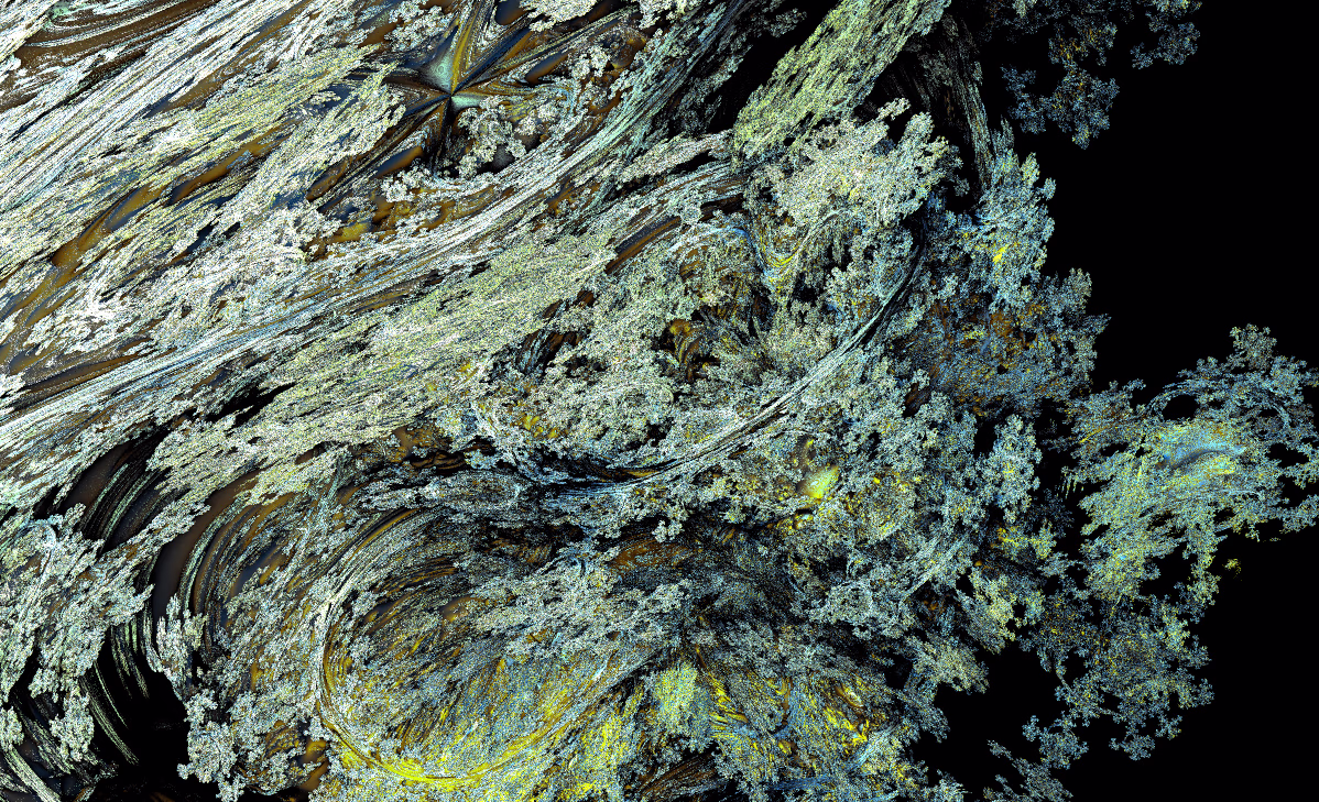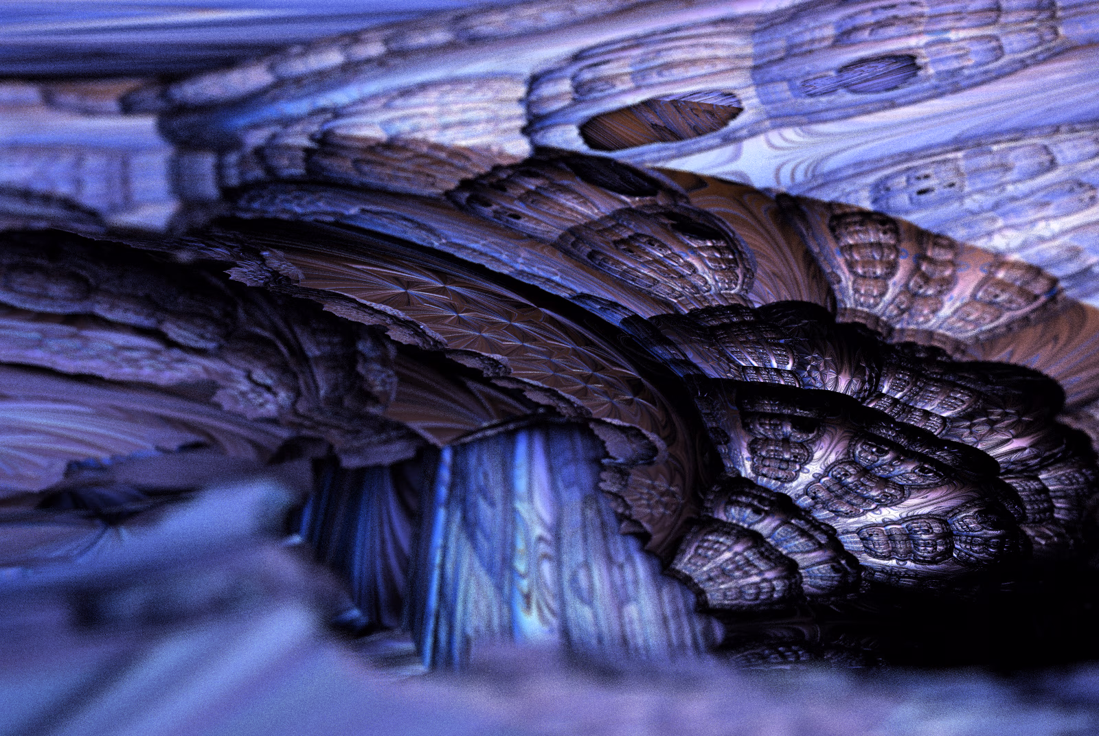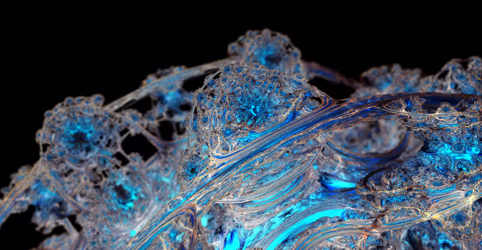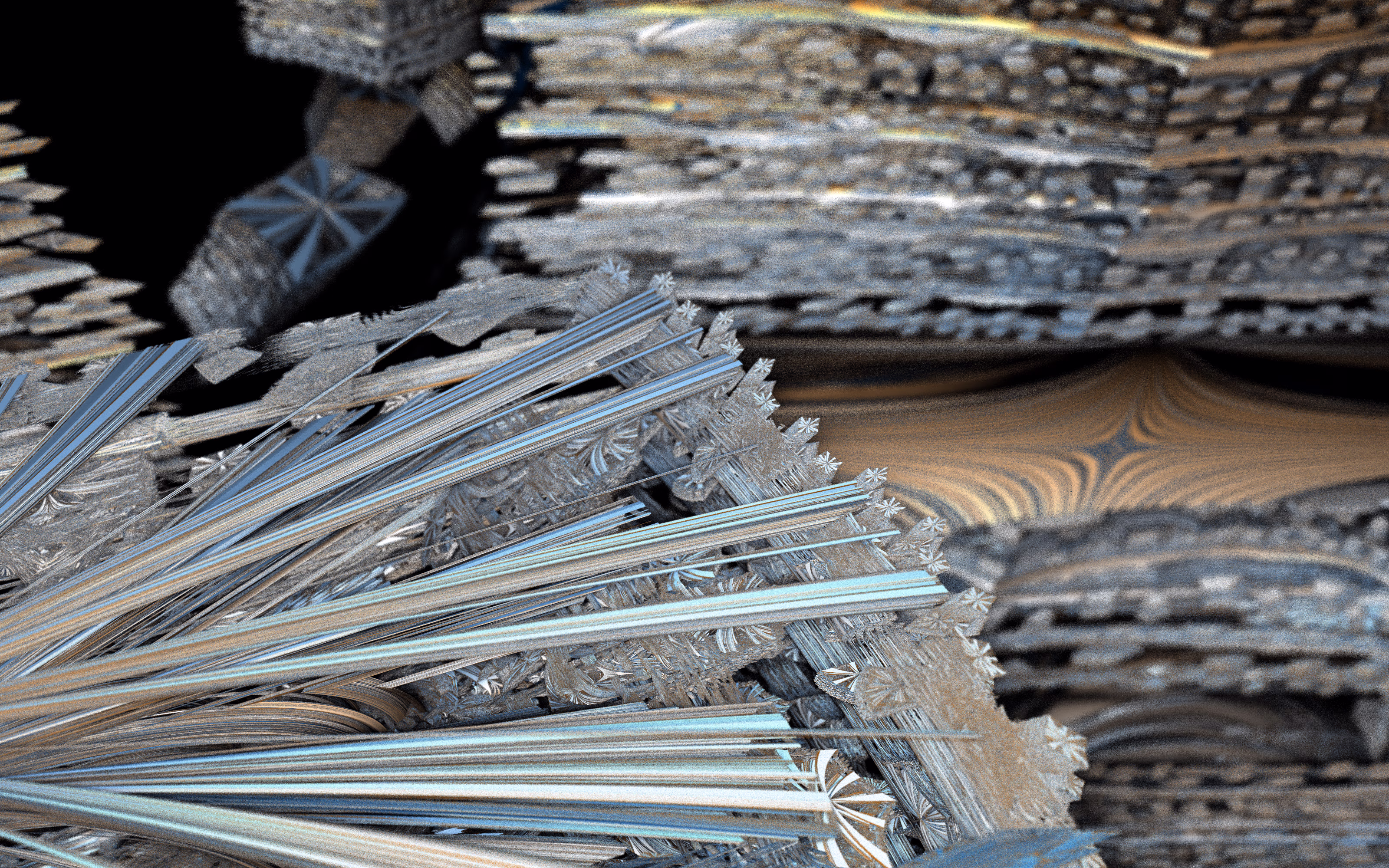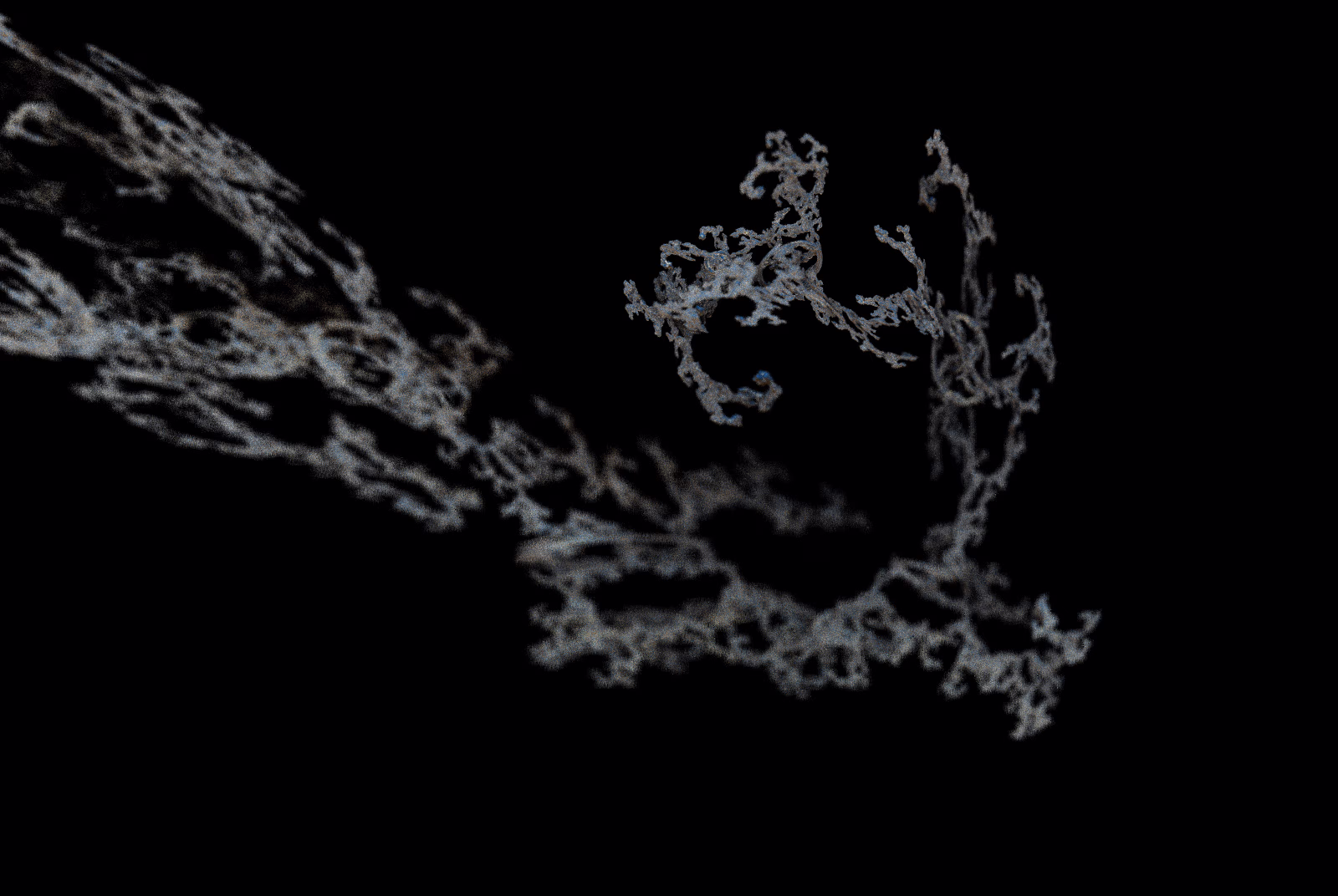I wrote a custom GPU-based program to render the images in tiles, with multiple passes for supersampling. It has a virtual camera with a lens and a focal length, which I've adjusted so that the most interesting parts are in focus. Without a depth of field, the details are often difficult to see against a background of infinitely many more self-similar details. The focus gives objects a sense of depth when the background is decoratively blurred and the focal point becomes highlighted. The camera lens's diameter also adds a reference scale to the image. Without it, the fractal would look identical at all scales!