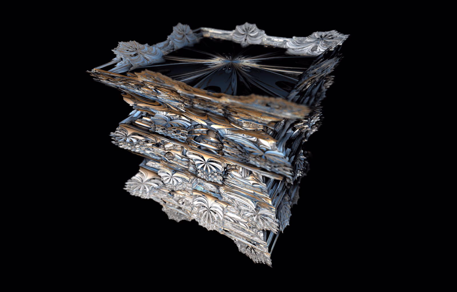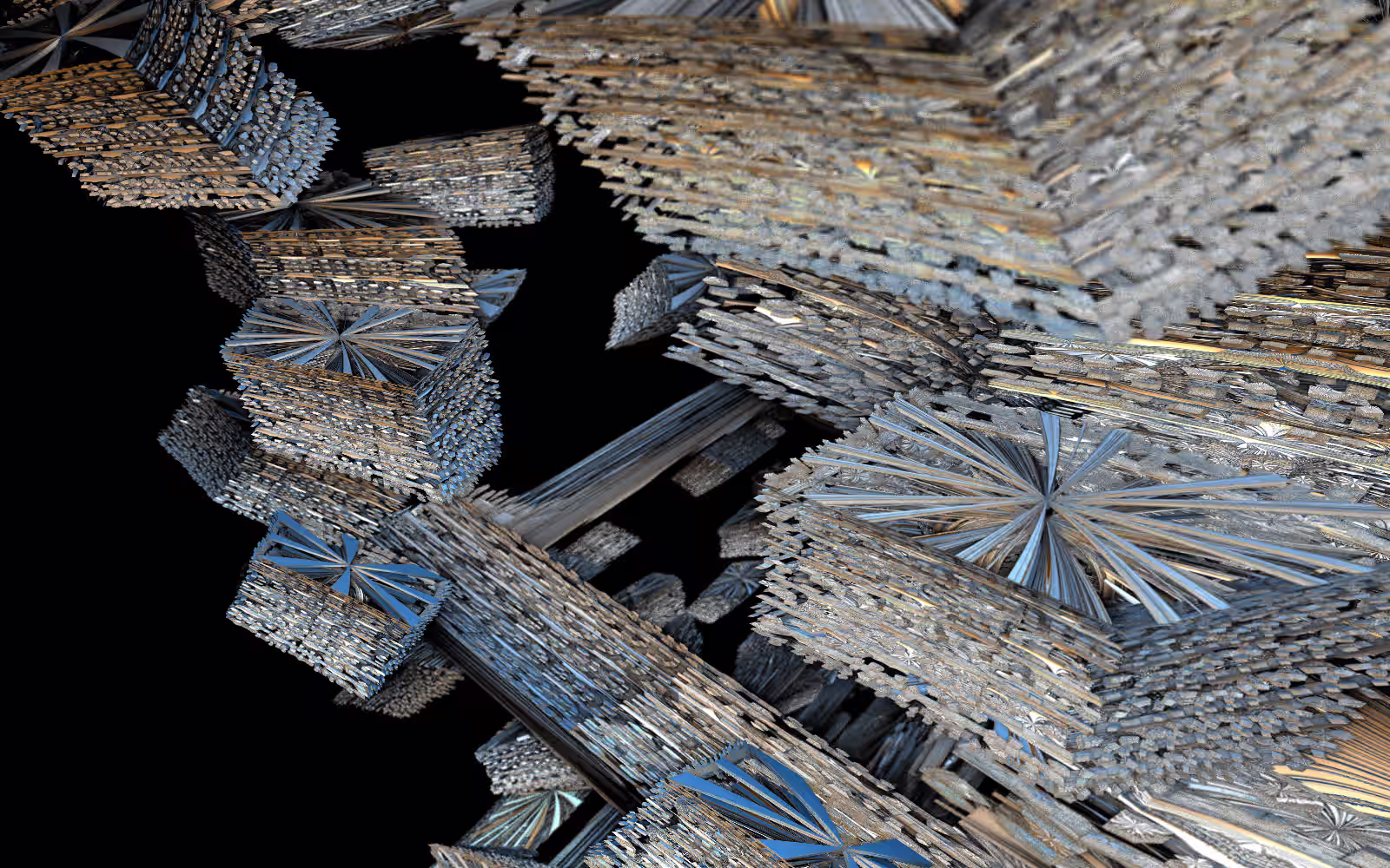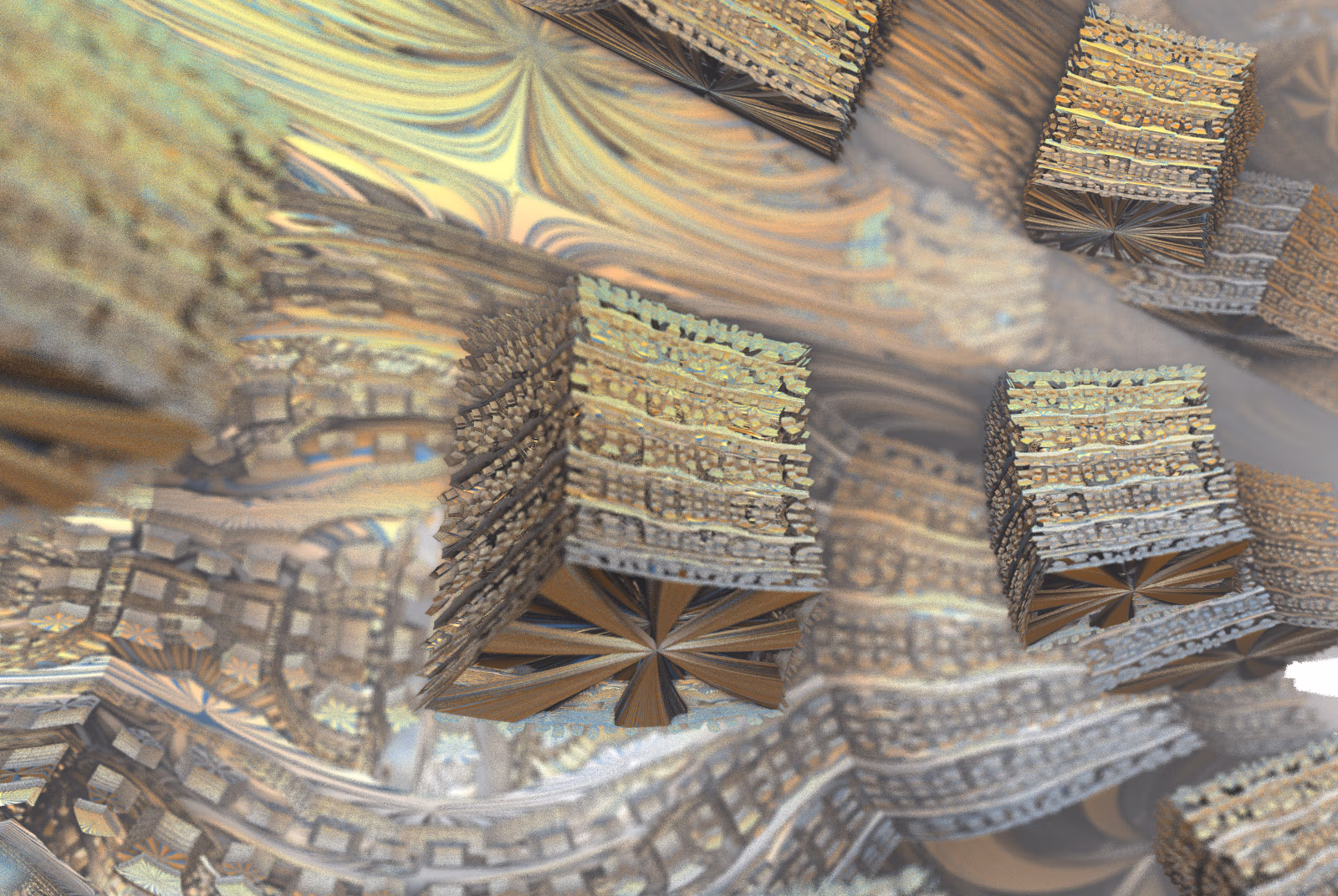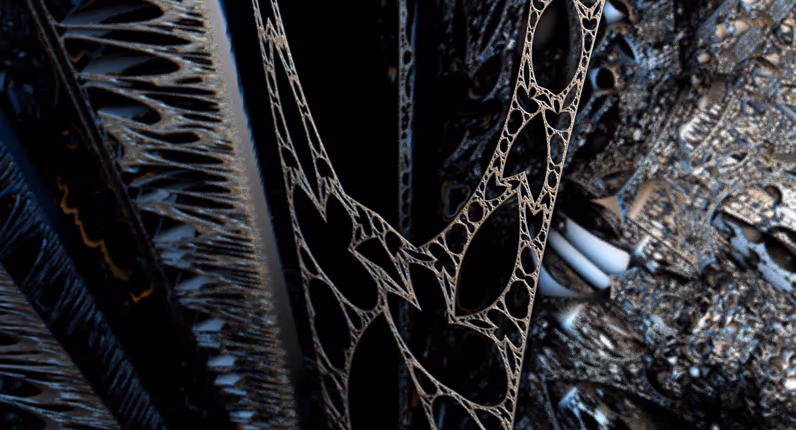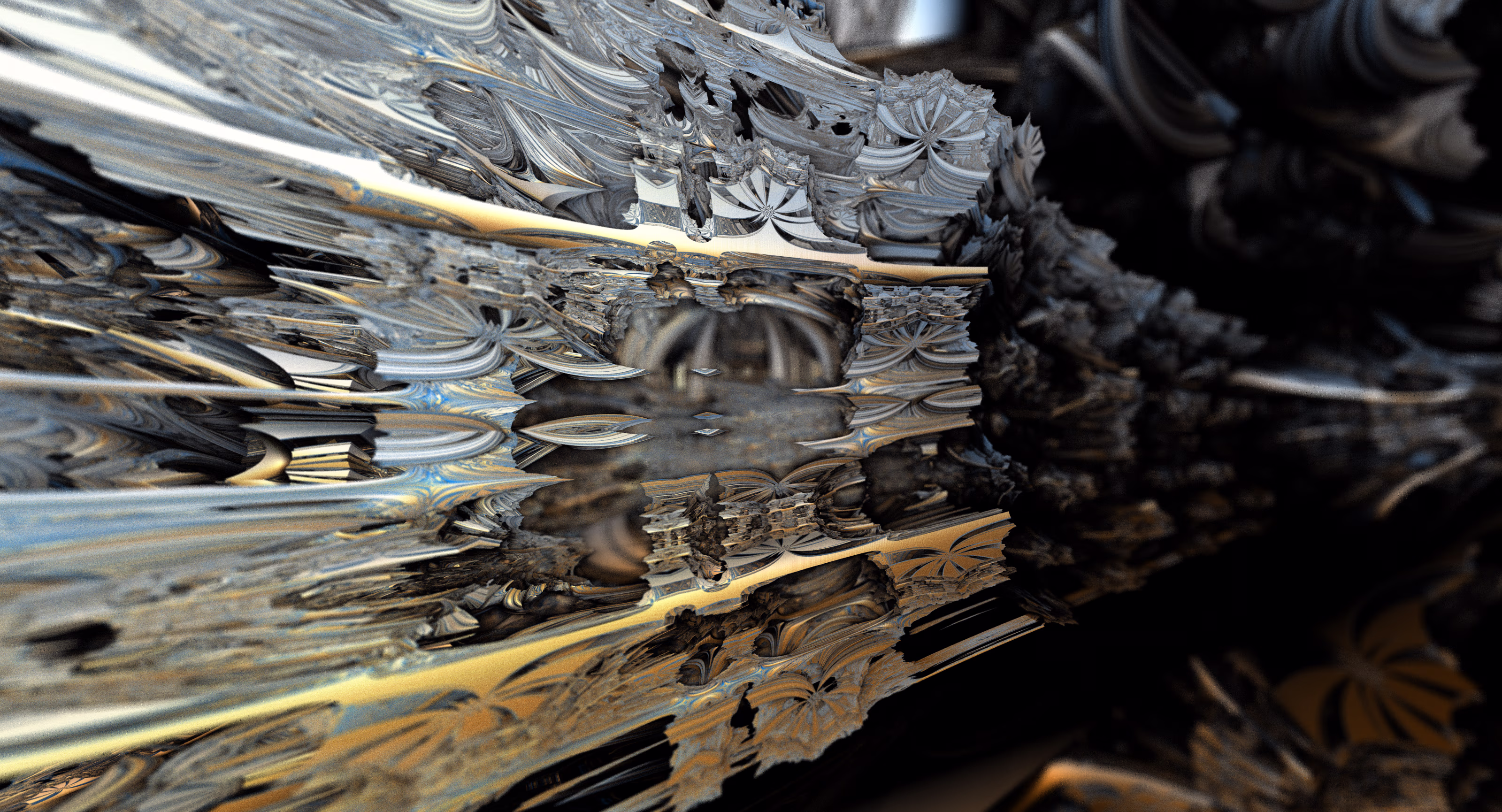 I wrote a custom GPU-based program to render the images in tiles, with multiple passes for supersampling. It has a virtual camera with a lens and a focal length, which I've adjusted so that the most interesting parts are in focus. Without a depth of field, the details are often difficult to see against a background of infinitely many more self-similar details. The focus gives objects a sense of depth when the background is decoratively blurred and the focal point becomes highlighted. The camera lens's diameter also adds a reference scale to the image. Without it, the fractal would look identical at all scales!