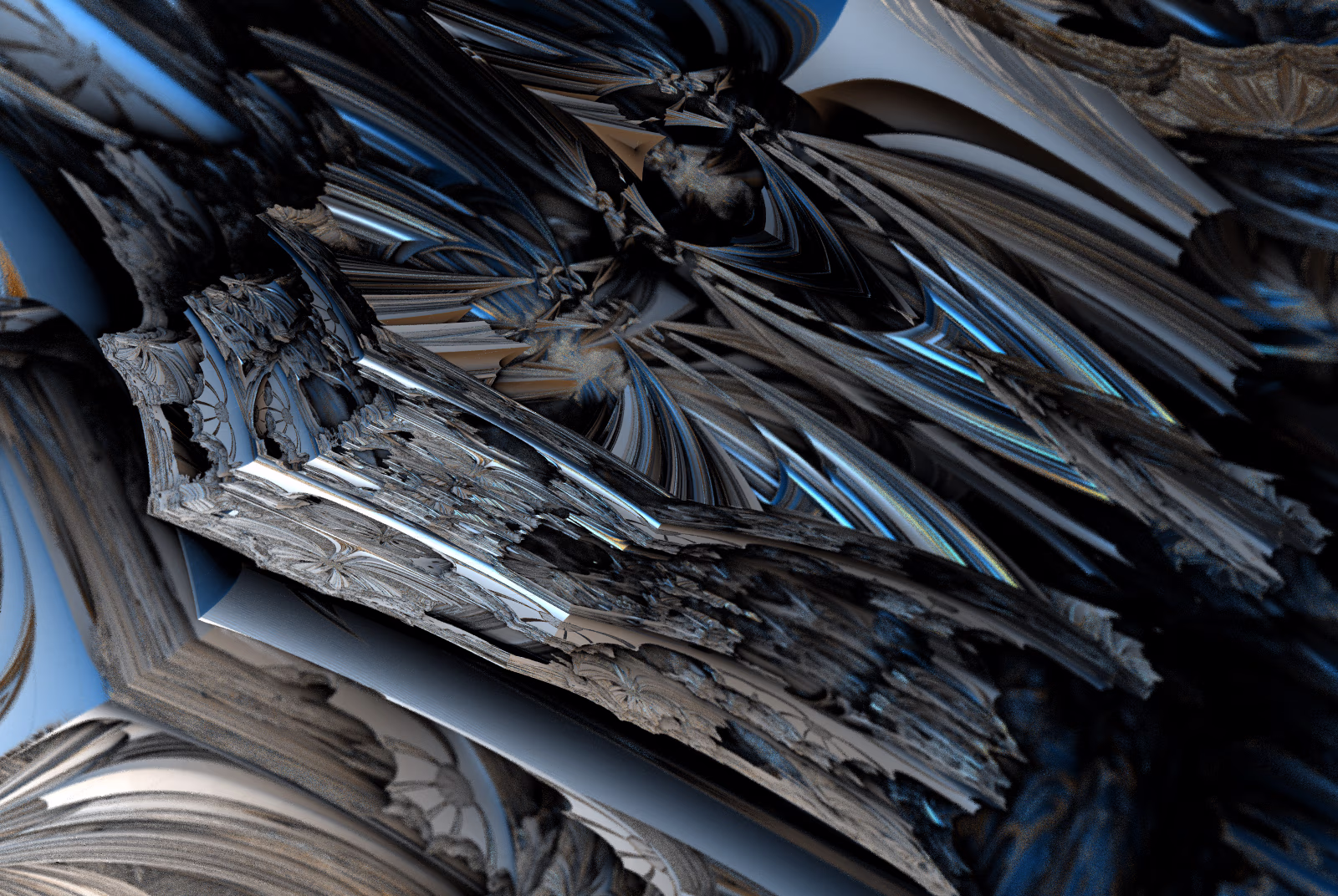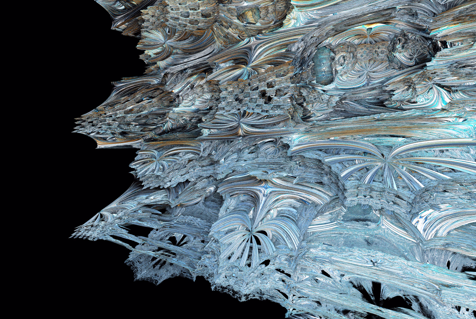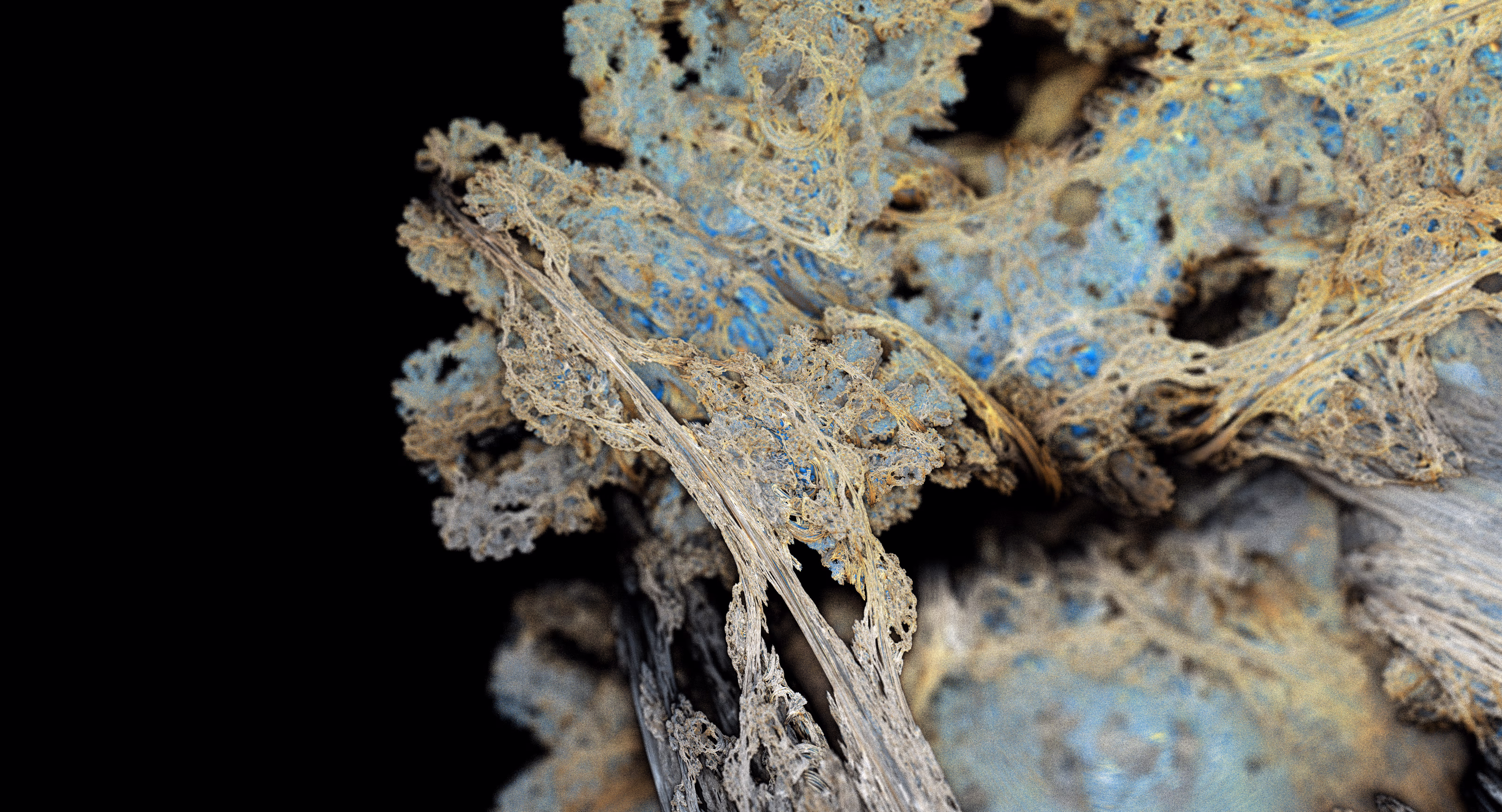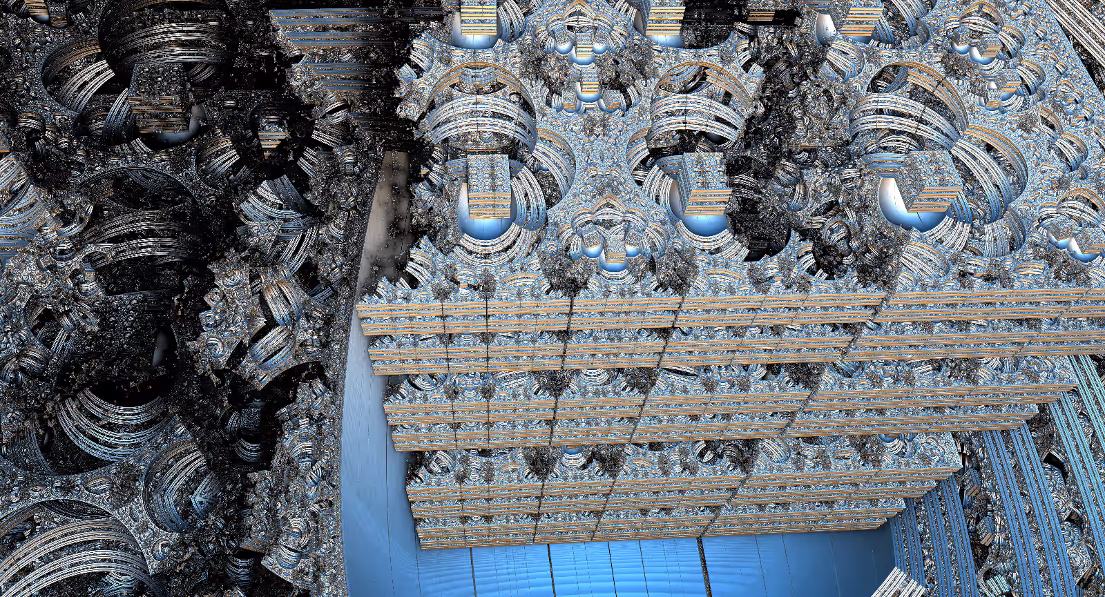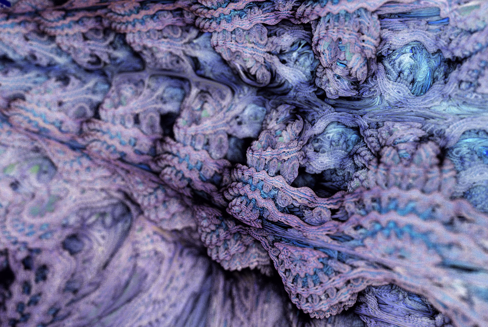 I wrote a custom GPU-based program to render the images in tiles, with multiple passes for supersampling. It has a virtual camera with a lens and a focal length, which I've adjusted so that the most interesting parts are in focus. Without a depth of field, the details are often difficult to see against a background of infinitely many more self-similar details. The focus gives objects a sense of depth when the background is decoratively blurred and the focal point becomes highlighted. The camera lens's diameter also adds a reference scale to the image. Without it, the fractal would look identical at all scales!