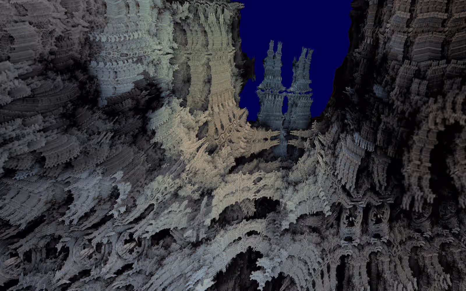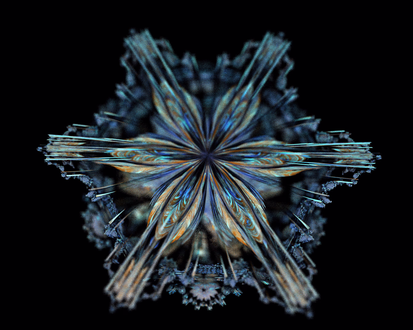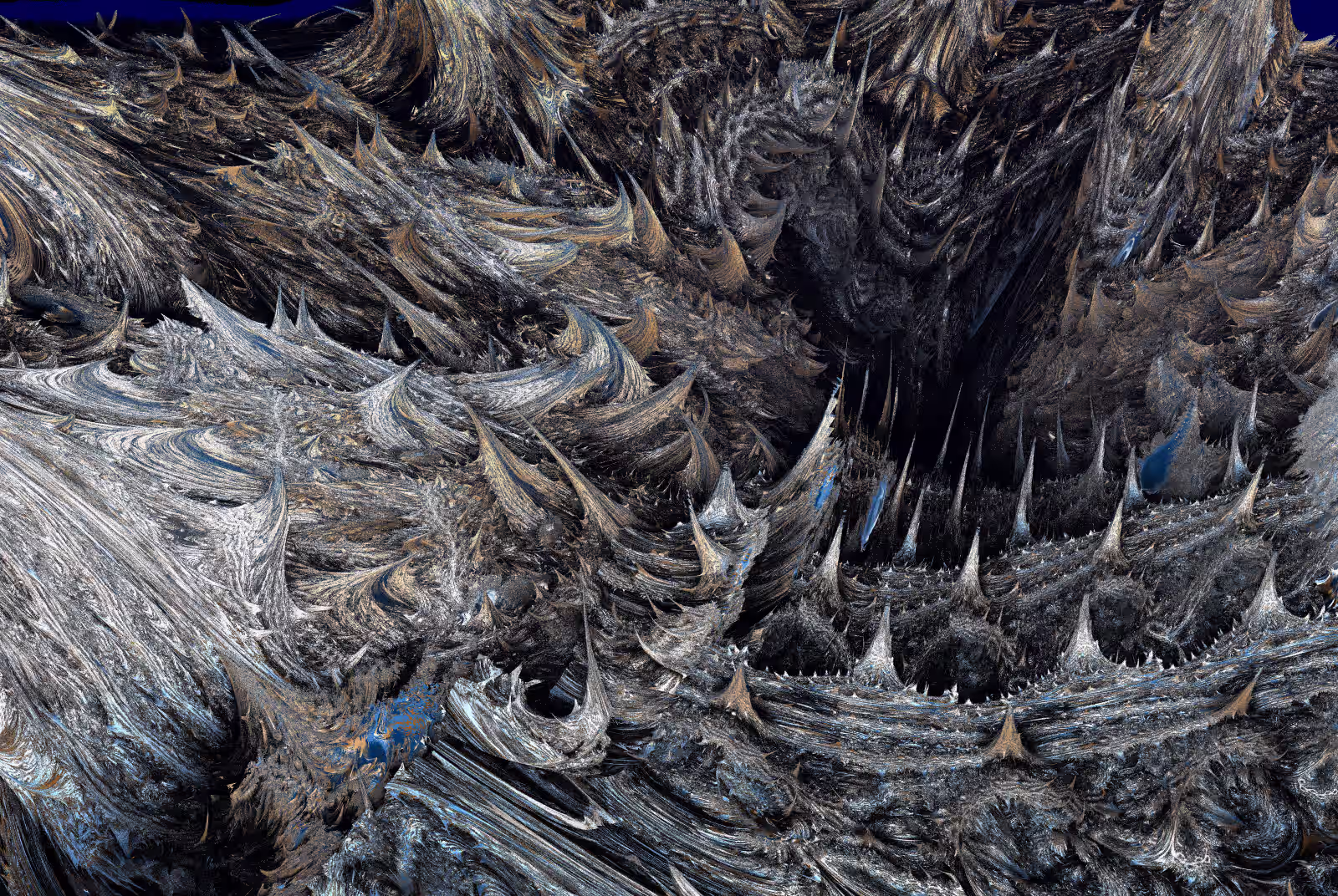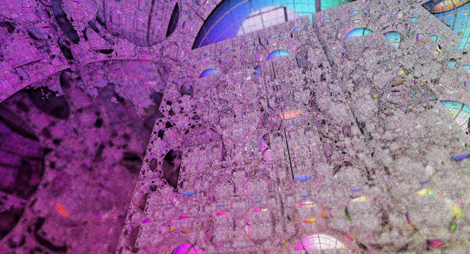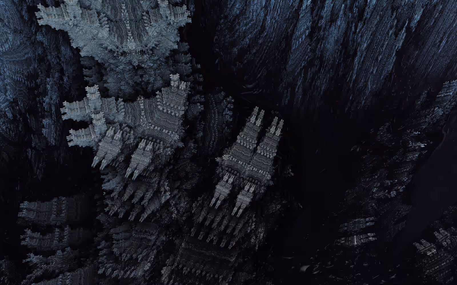 I wrote a custom GPU-based program to render the images in tiles, with multiple passes for supersampling. It has a virtual camera with a lens and a focal length, which I've adjusted so that the most interesting parts are in focus. Without a depth of field, the details are often difficult to see against a background of infinitely many more self-similar details. The focus gives objects a sense of depth when the background is decoratively blurred and the focal point becomes highlighted. The camera lens's diameter also adds a reference scale to the image. Without it, the fractal would look identical at all scales!