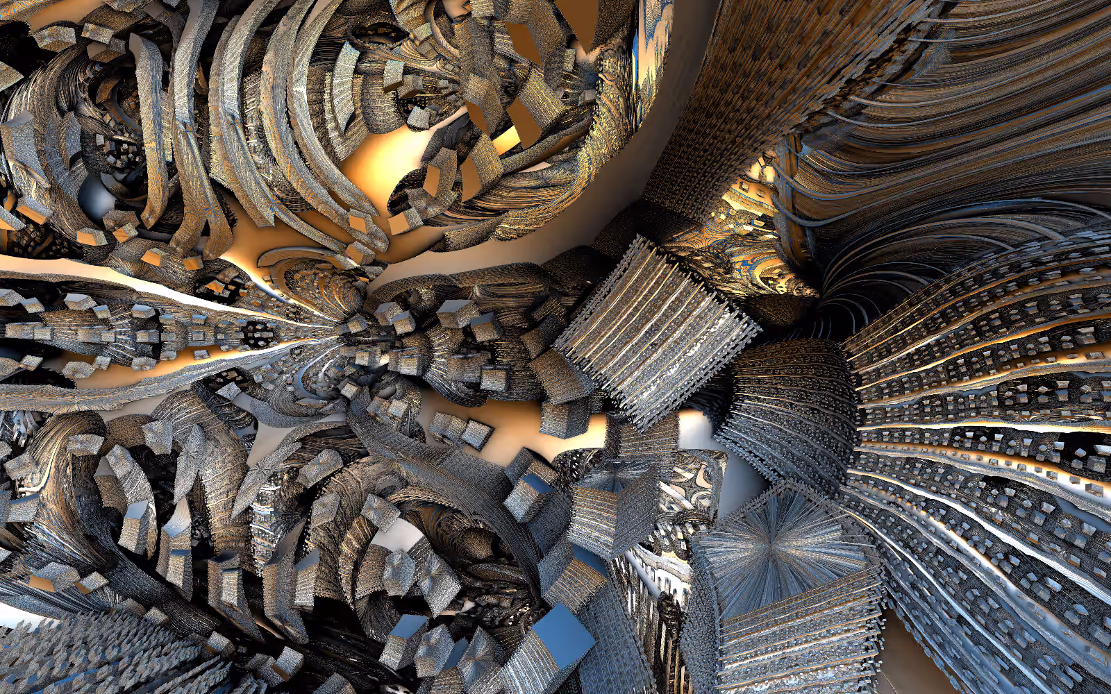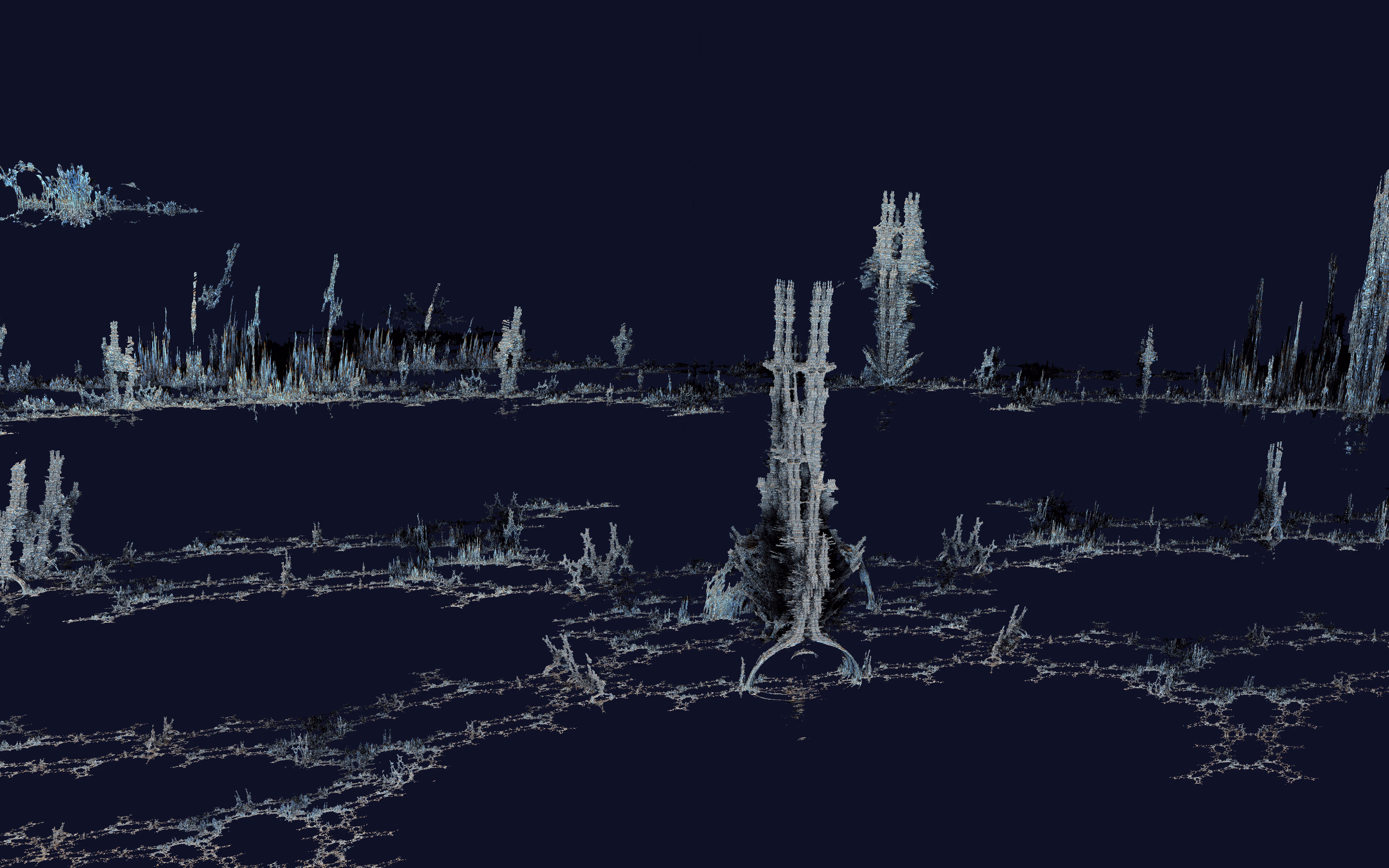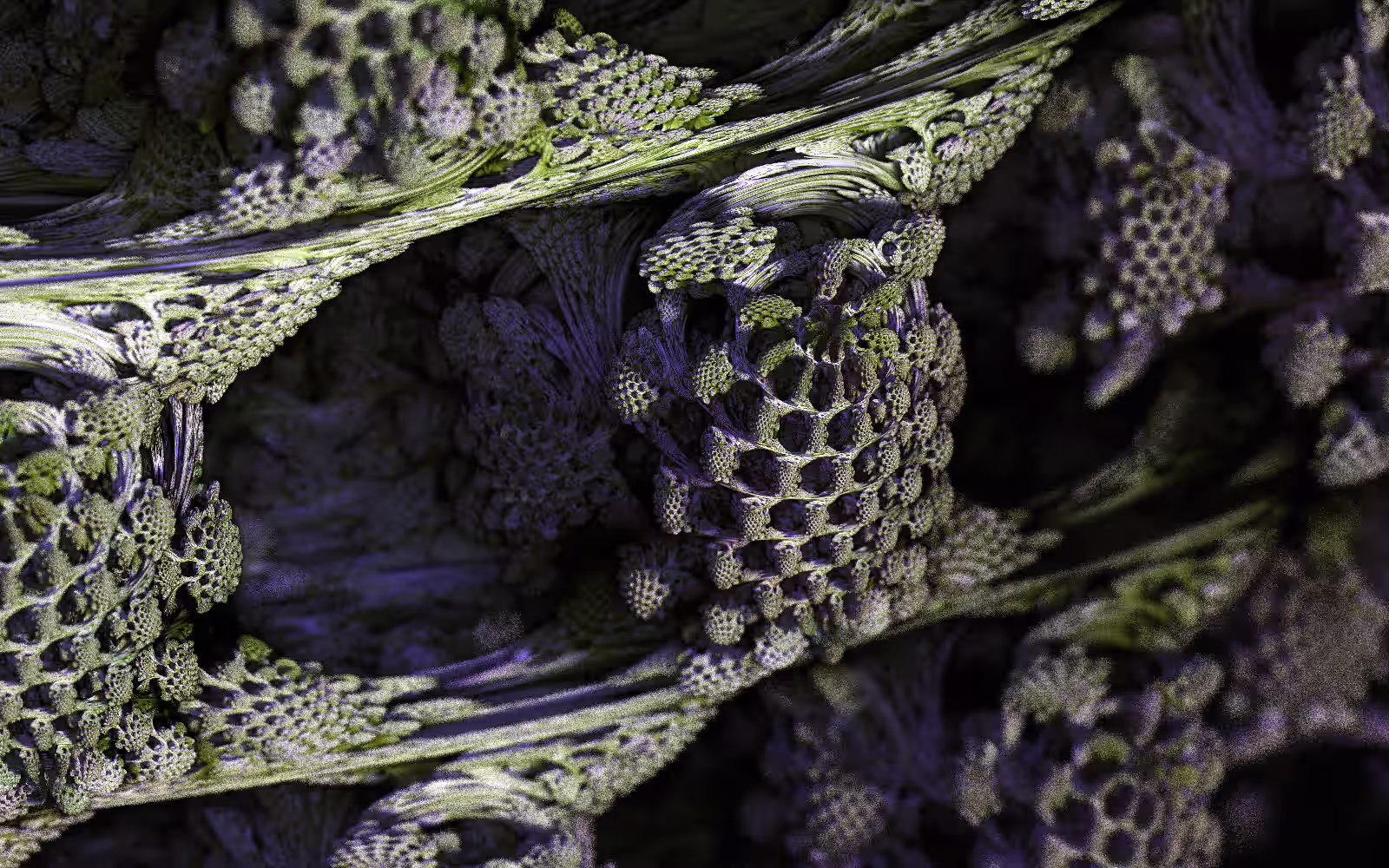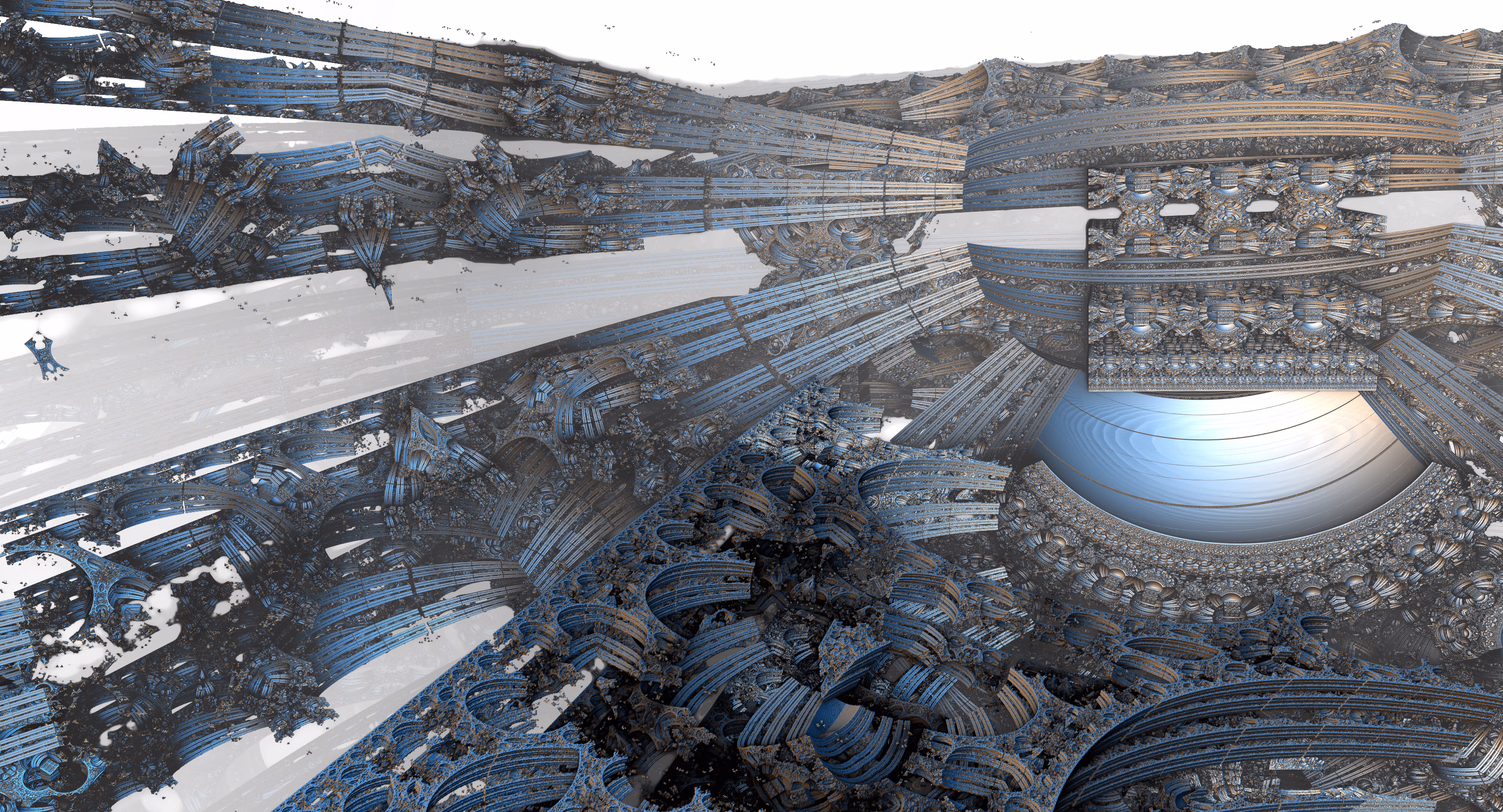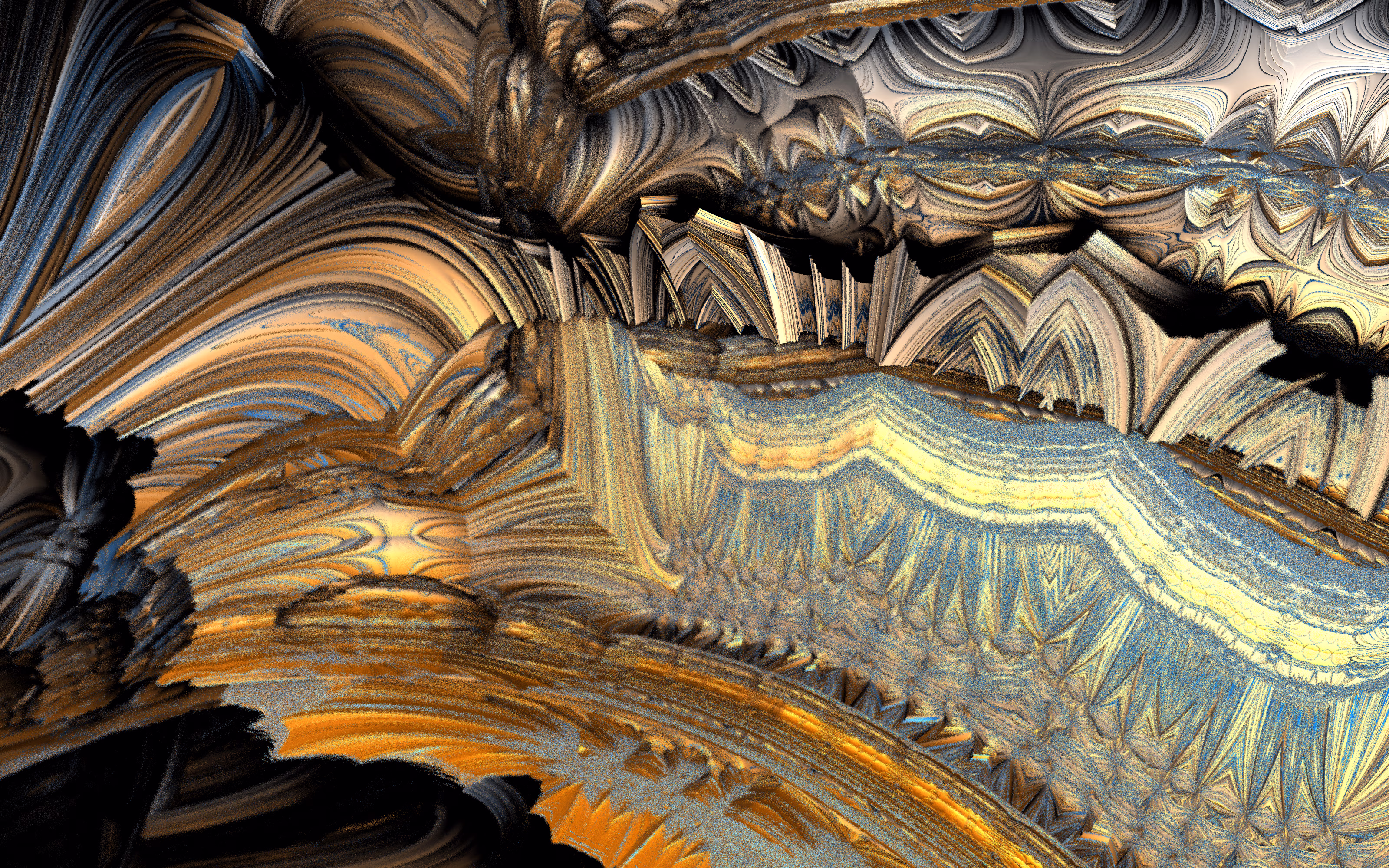 I wrote a custom GPU-based program to render the images in tiles, with multiple passes for supersampling. It has a virtual camera with a lens and a focal length, which I've adjusted so that the most interesting parts are in focus. Without a depth of field, the details are often difficult to see against a background of infinitely many more self-similar details. The focus gives objects a sense of depth when the background is decoratively blurred and the focal point becomes highlighted. The camera lens's diameter also adds a reference scale to the image. Without it, the fractal would look identical at all scales!