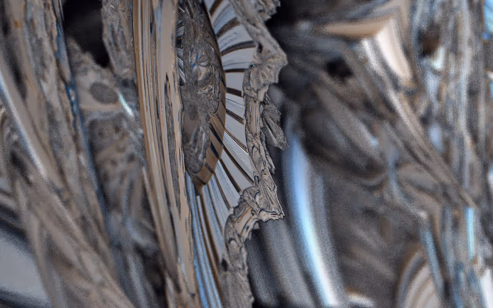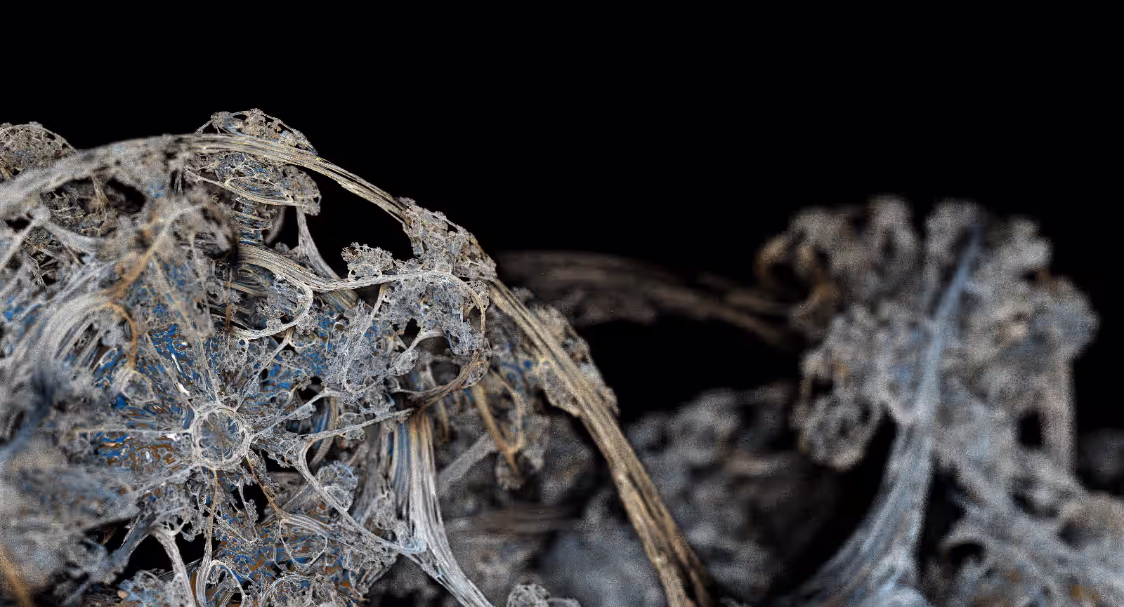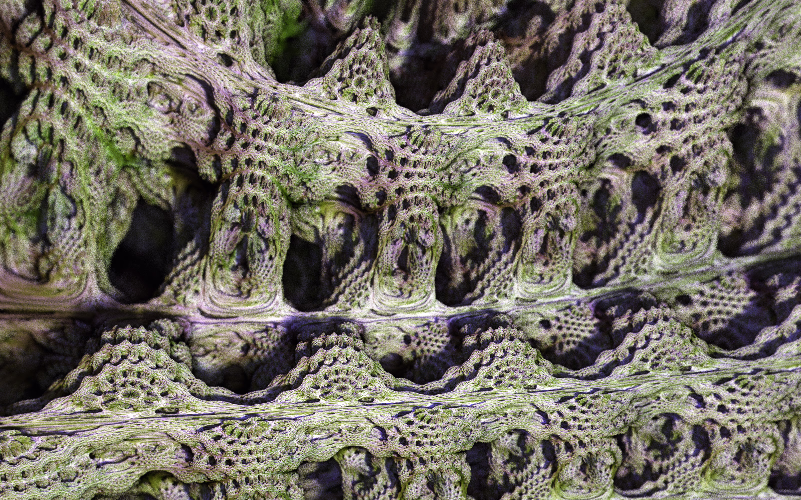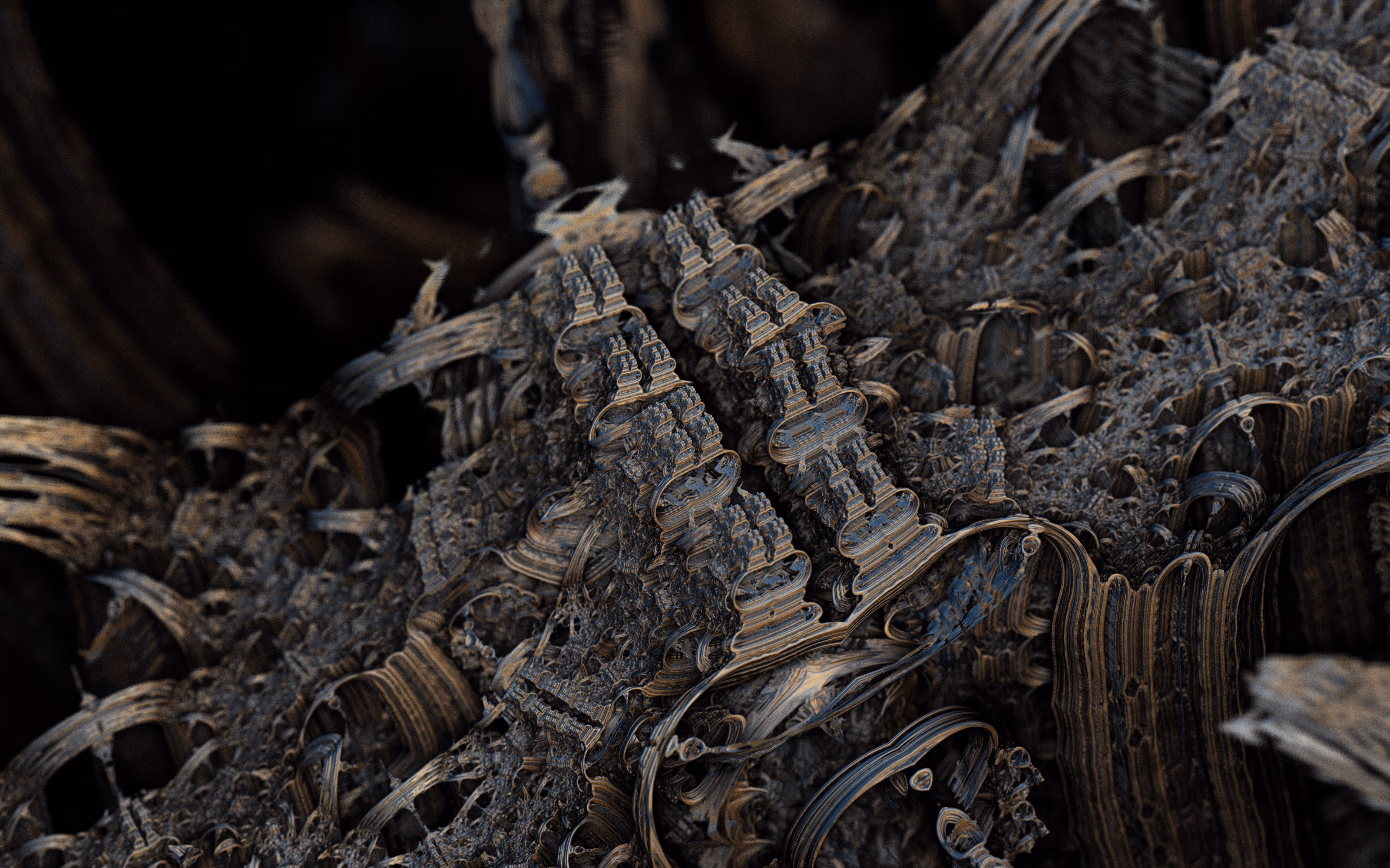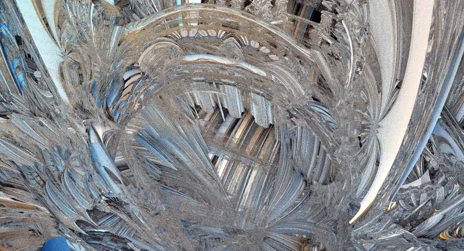 I wrote a custom GPU-based program to render the images in tiles, with multiple passes for supersampling. It has a virtual camera with a lens and a focal length, which I've adjusted so that the most interesting parts are in focus. Without a depth of field, the details are often difficult to see against a background of infinitely many more self-similar details. The focus gives objects a sense of depth when the background is decoratively blurred and the focal point becomes highlighted. The camera lens's diameter also adds a reference scale to the image. Without it, the fractal would look identical at all scales!