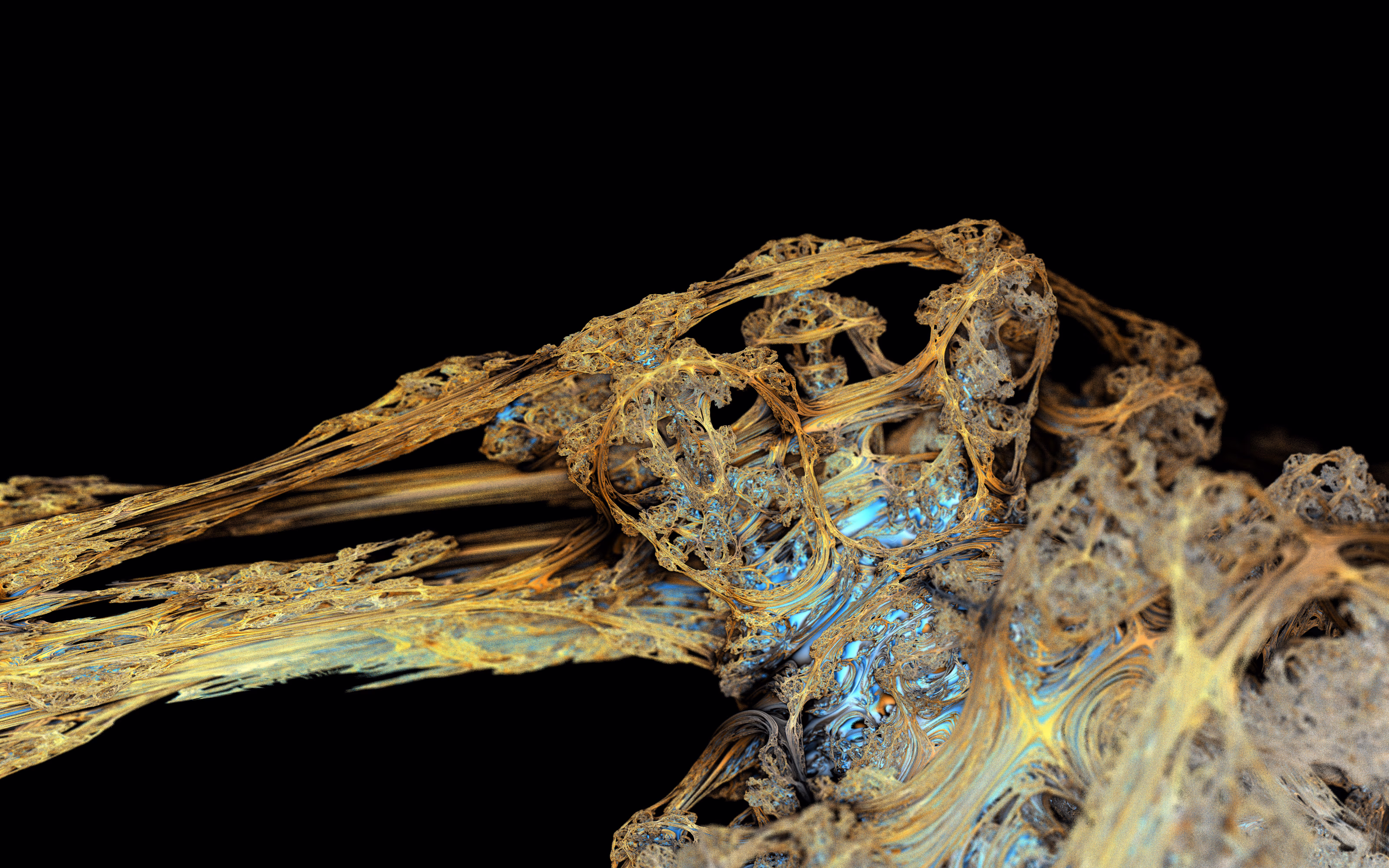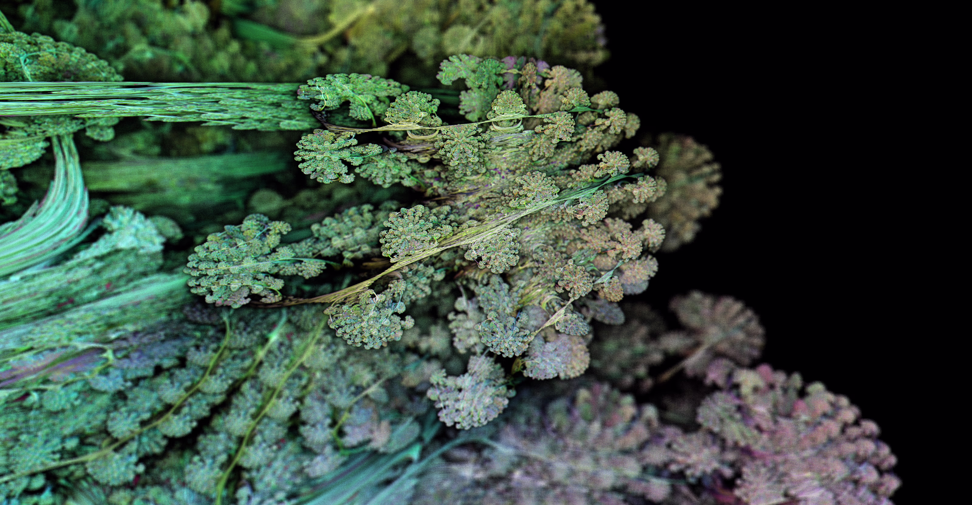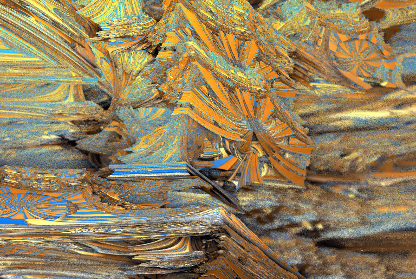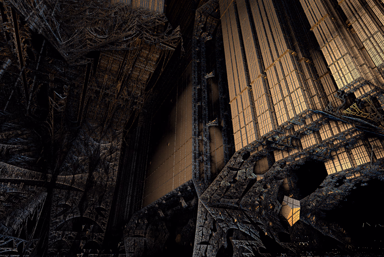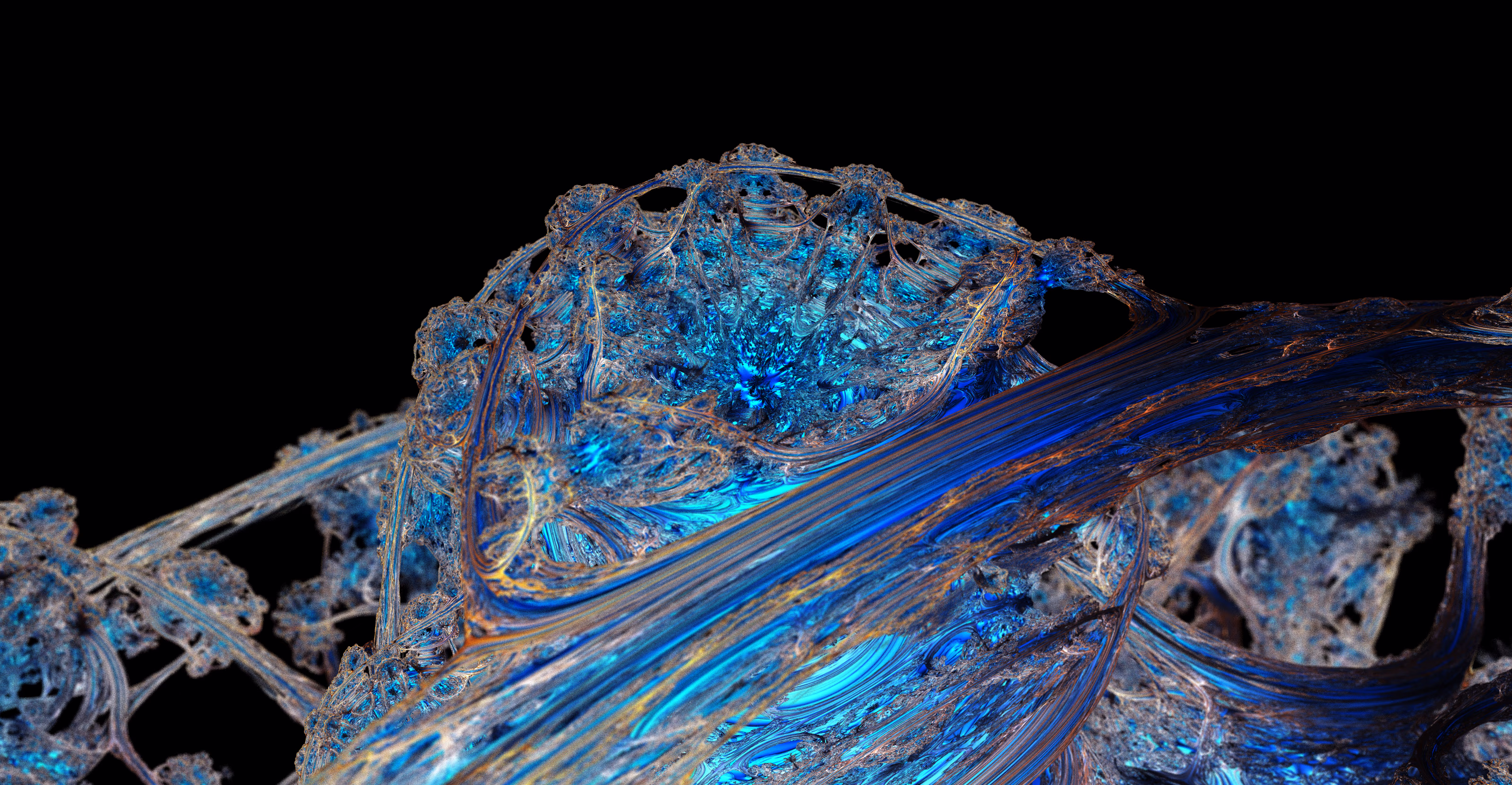 I wrote a custom GPU-based program to render the images in tiles, with multiple passes for supersampling. It has a virtual camera with a lens and a focal length, which I've adjusted so that the most interesting parts are in focus. Without a depth of field, the details are often difficult to see against a background of infinitely many more self-similar details. The focus gives objects a sense of depth when the background is decoratively blurred and the focal point becomes highlighted. The camera lens's diameter also adds a reference scale to the image. Without it, the fractal would look identical at all scales!