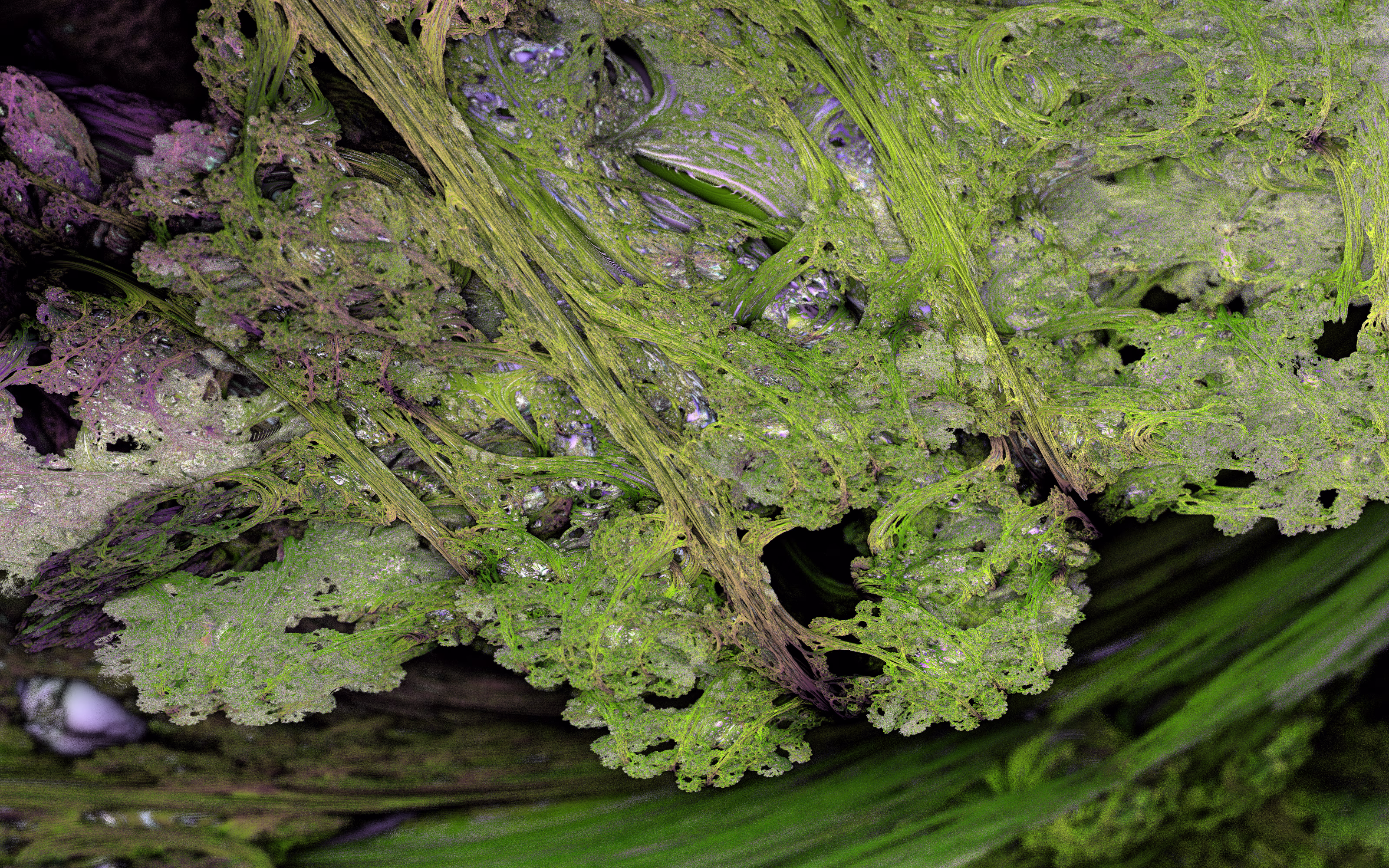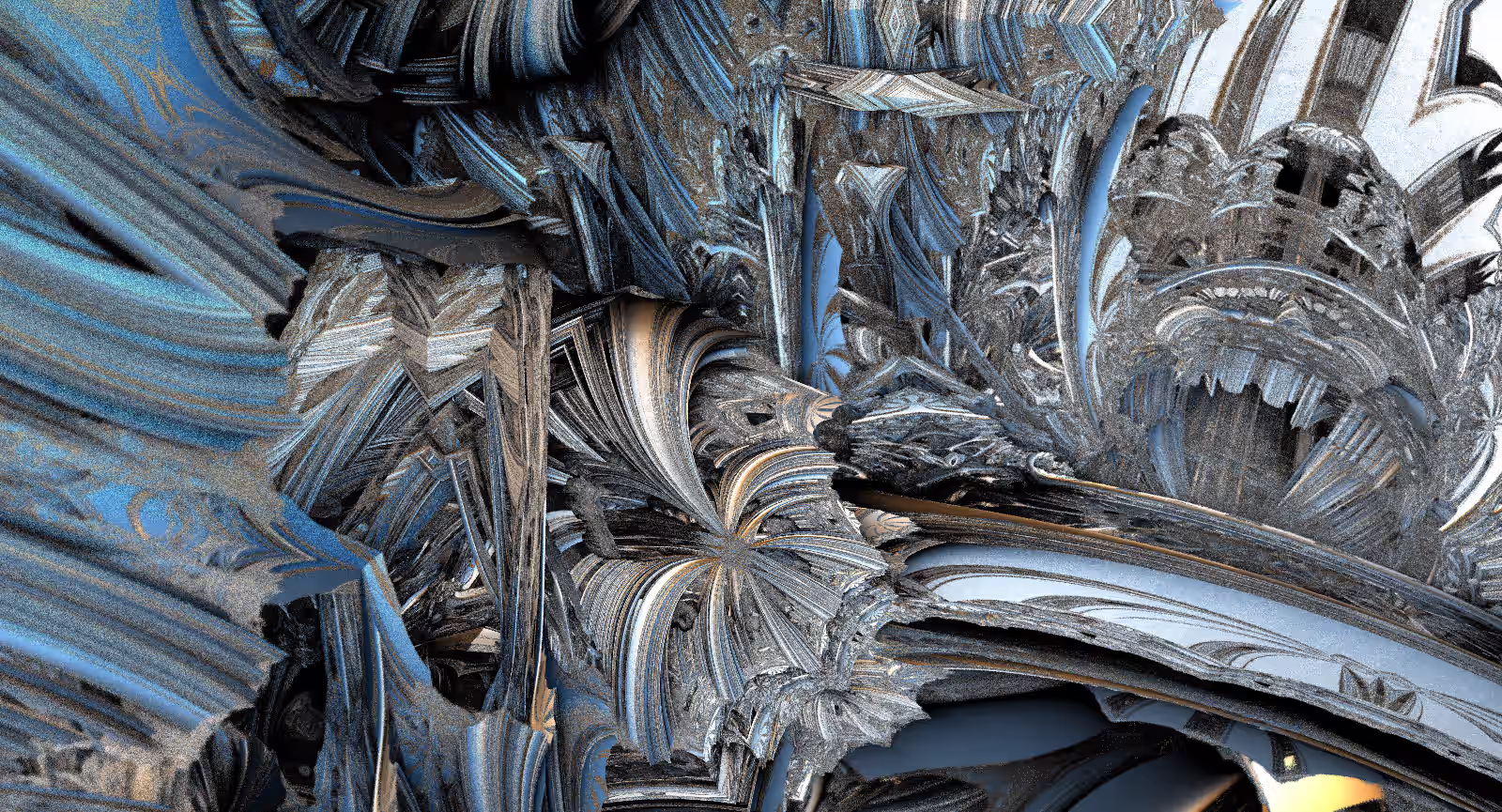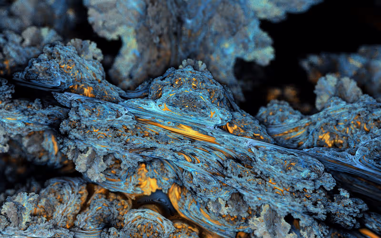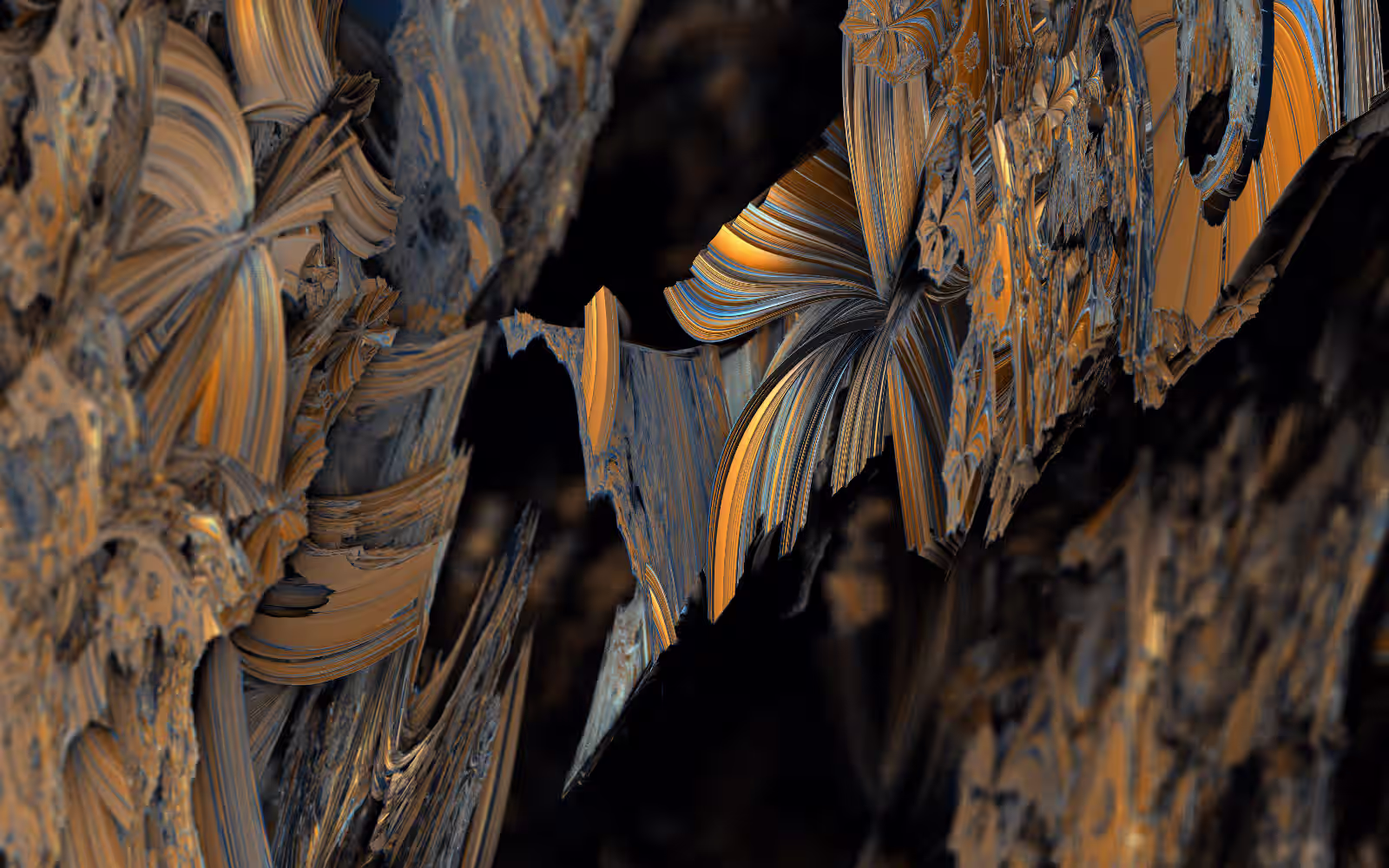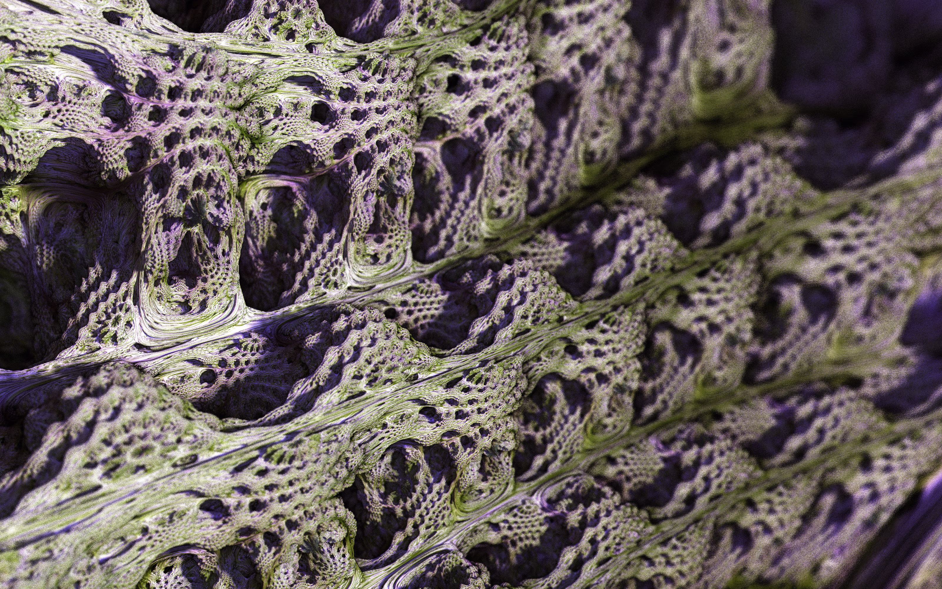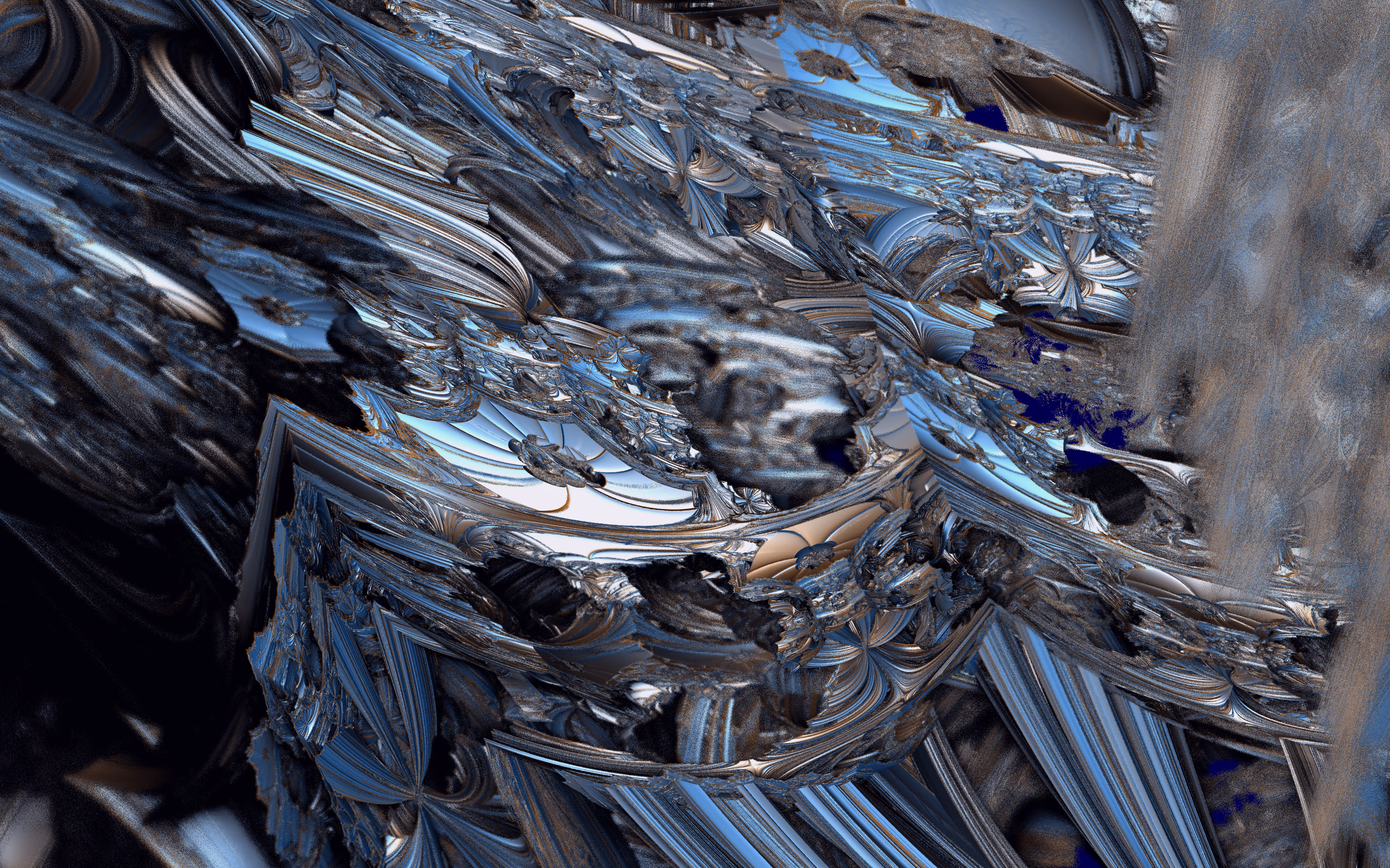 I wrote a custom GPU-based program to render the images in tiles, with multiple passes for supersampling. It has a virtual camera with a lens and a focal length, which I've adjusted so that the most interesting parts are in focus. Without a depth of field, the details are often difficult to see against a background of infinitely many more self-similar details. The focus gives objects a sense of depth when the background is decoratively blurred and the focal point becomes highlighted. The camera lens's diameter also adds a reference scale to the image. Without it, the fractal would look identical at all scales!