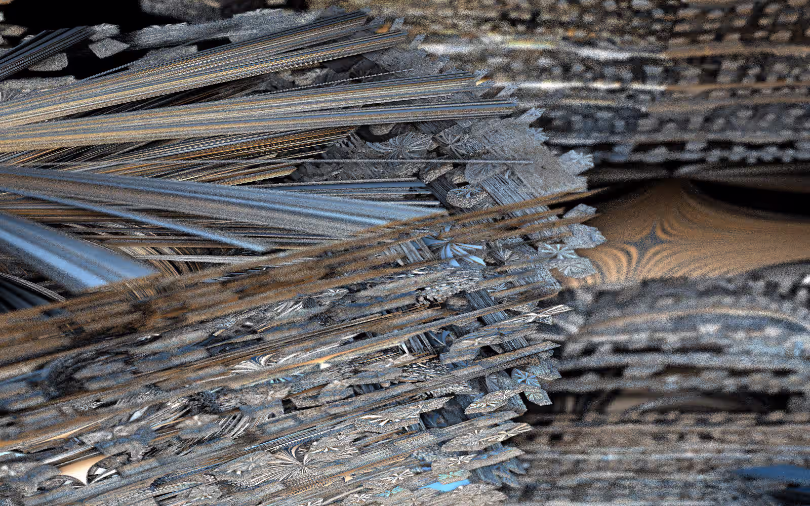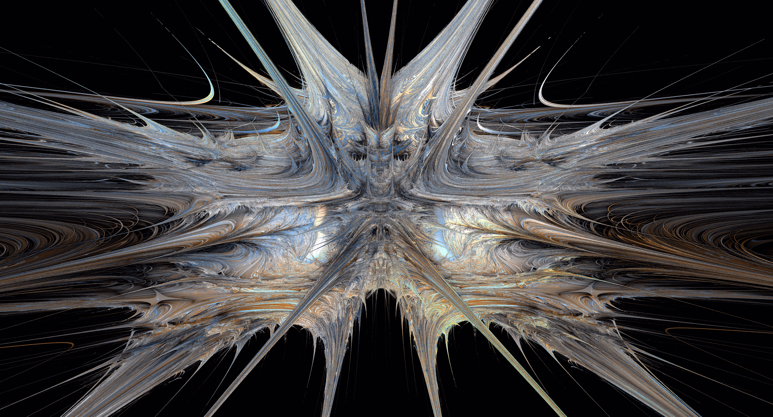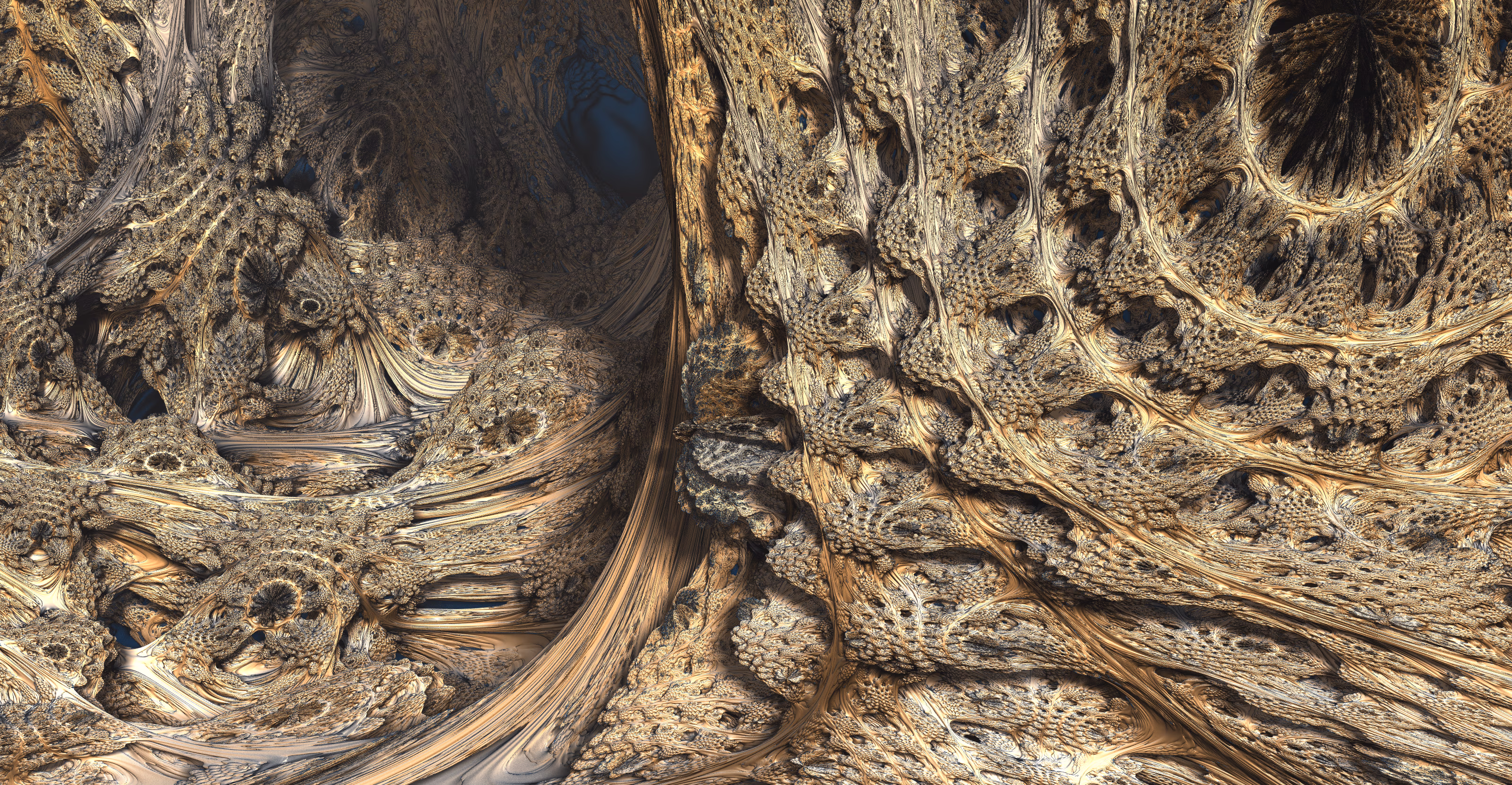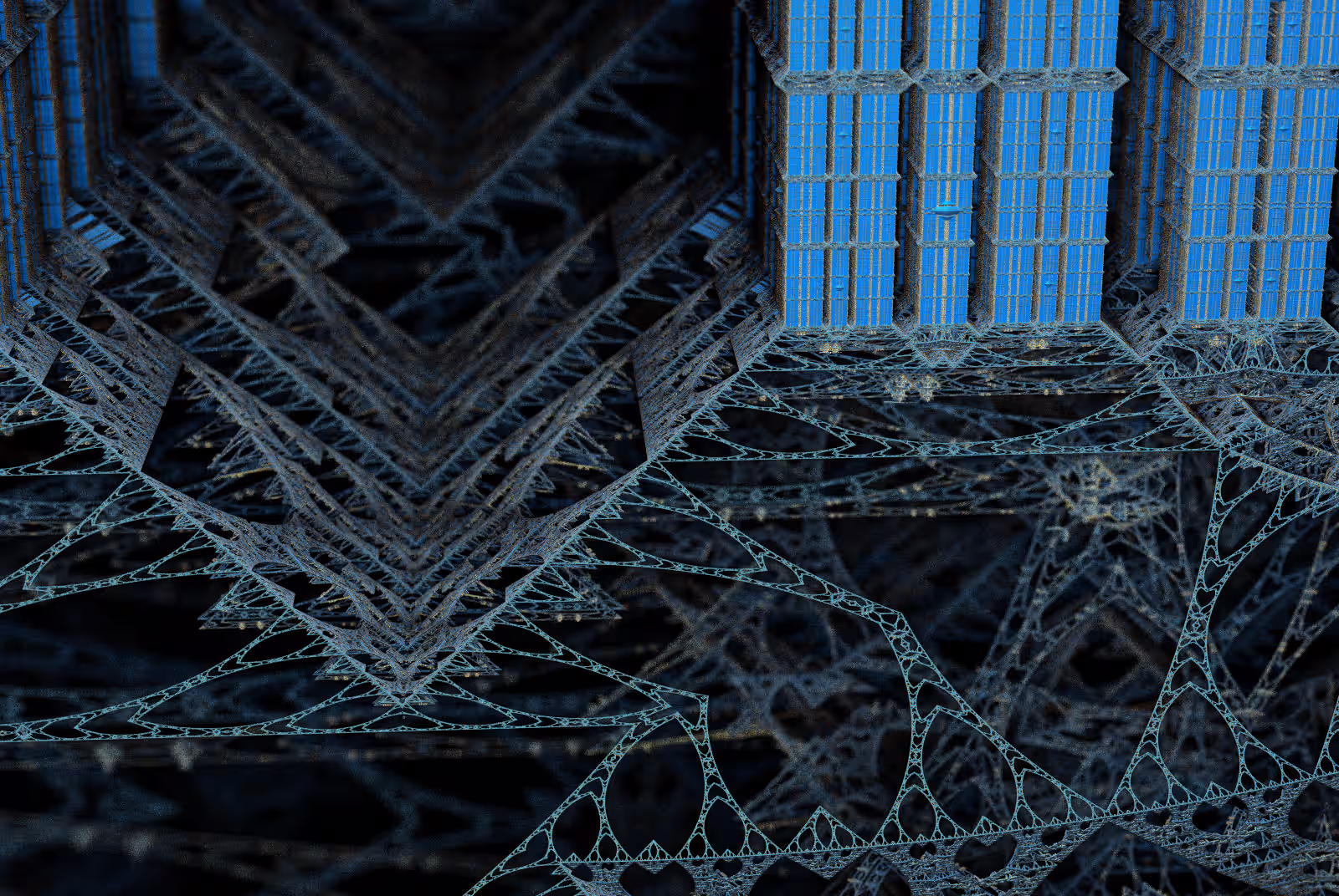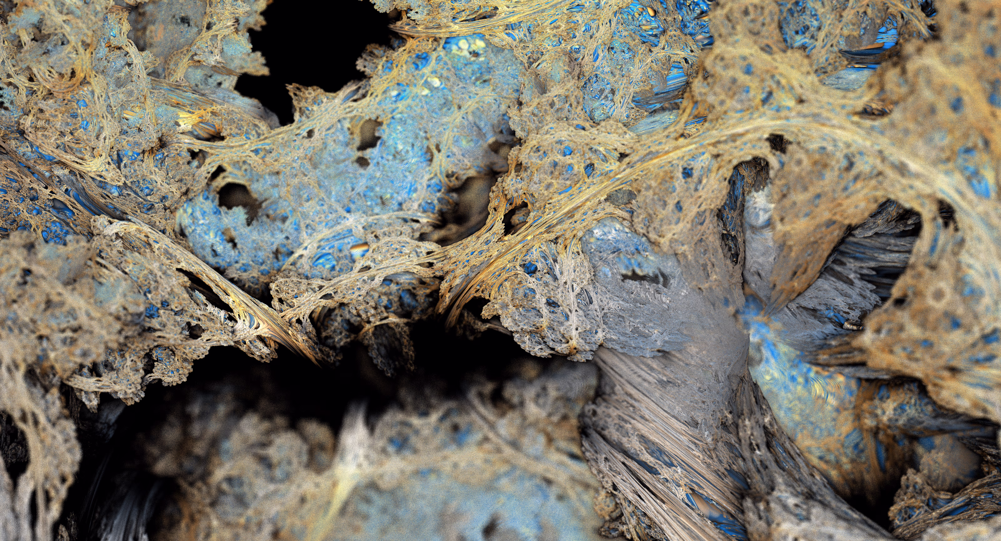 I wrote a custom GPU-based program to render the images in tiles, with multiple passes for supersampling. It has a virtual camera with a lens and a focal length, which I've adjusted so that the most interesting parts are in focus. Without a depth of field, the details are often difficult to see against a background of infinitely many more self-similar details. The focus gives objects a sense of depth when the background is decoratively blurred and the focal point becomes highlighted. The camera lens's diameter also adds a reference scale to the image. Without it, the fractal would look identical at all scales!