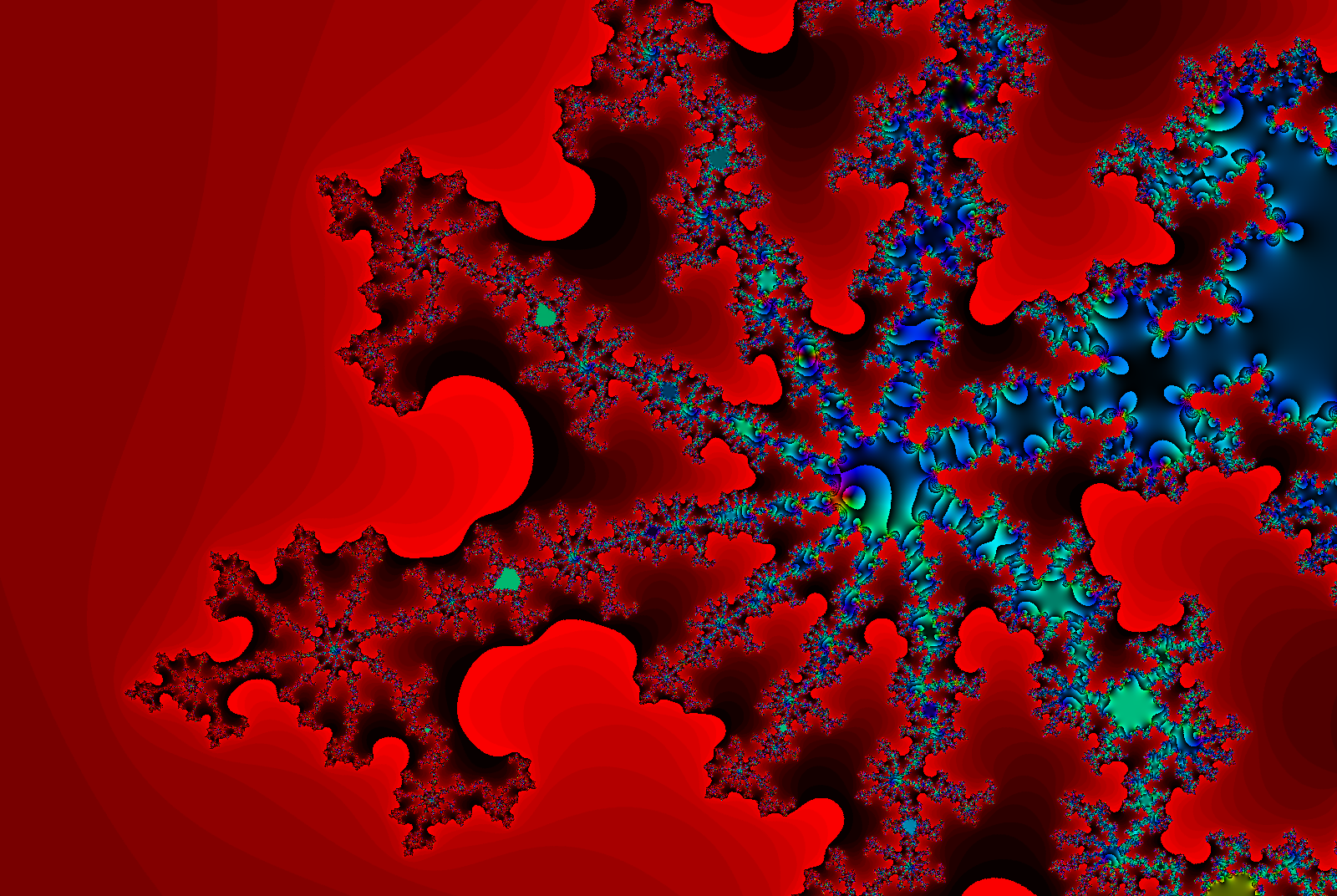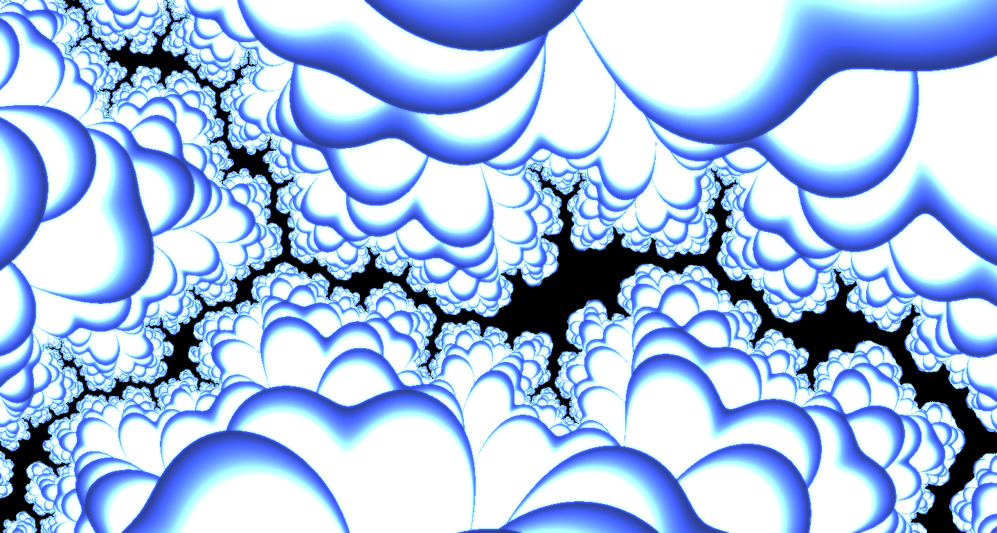These images are results of my experiments to create colorful details outside the Mandelbrot set. In the equation, each iteration refines the fractal boundary, and since it's a smooth function, the new boundary must have a smooth curve. Those are the bubble-shaped curves in the images, approaching the true boundary of the fractal with each iteration. The sweeping colors remind me of Post-Impressionist paintings at the end of the Romantic era.